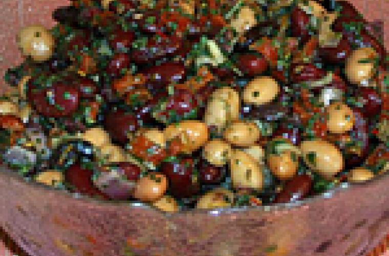 En god bönsallad är praktiskt att ha färdig i kylskåpet. Med oliver och soltorkade tomater blir det både nyttigt och supergott.