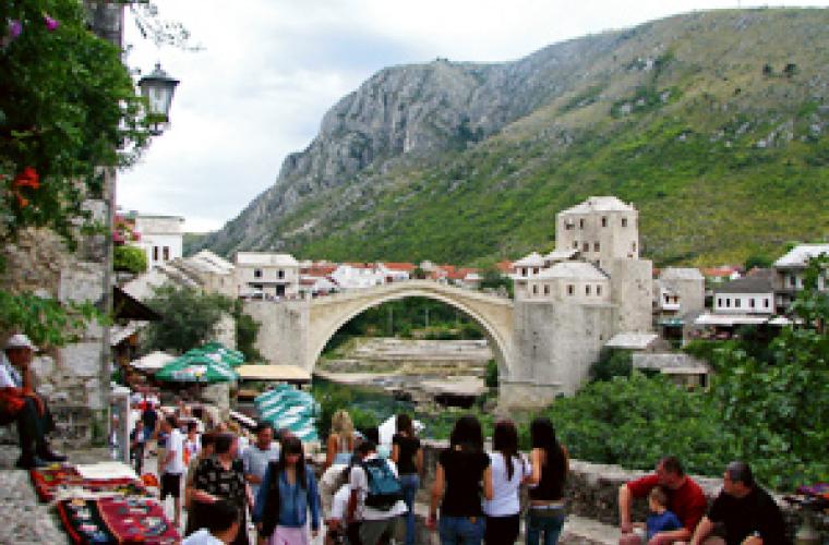 Nu närmar jag mig den gamla bro som givit Mostar sitt namn. Most betyder bro. Den vackra vita bron liknar en fiskmås. Måsen flyger över floden och binder samman stränderna med vita vingar, firar livet och symboliserar mångfalden. I det sista kriget raserades bron av granater, men efter kriget byggdes den upp igen.