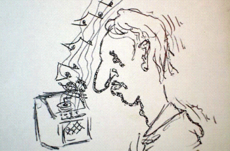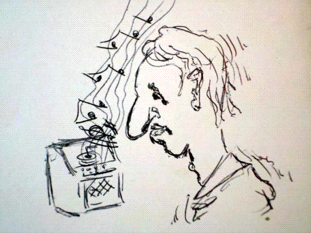 Den påverkade står kvar en stund och trycker in fler melodier för femkronan som han släppte ner i myntfacket, åt Sofia. I ögonvrån ser jag honom sedan gå tillbaka. Han sätter på sig jackan och slänger en halsduk runt nacken. Bra att han far nu, tänker jag och börjar ägna mig mitt fika igen. Men istället för att gå ut genom dörren så släpar han sig fram till vårt bord. Han stannar mitt i gången och tar upp Sofias mössa som har ramlat ner där.