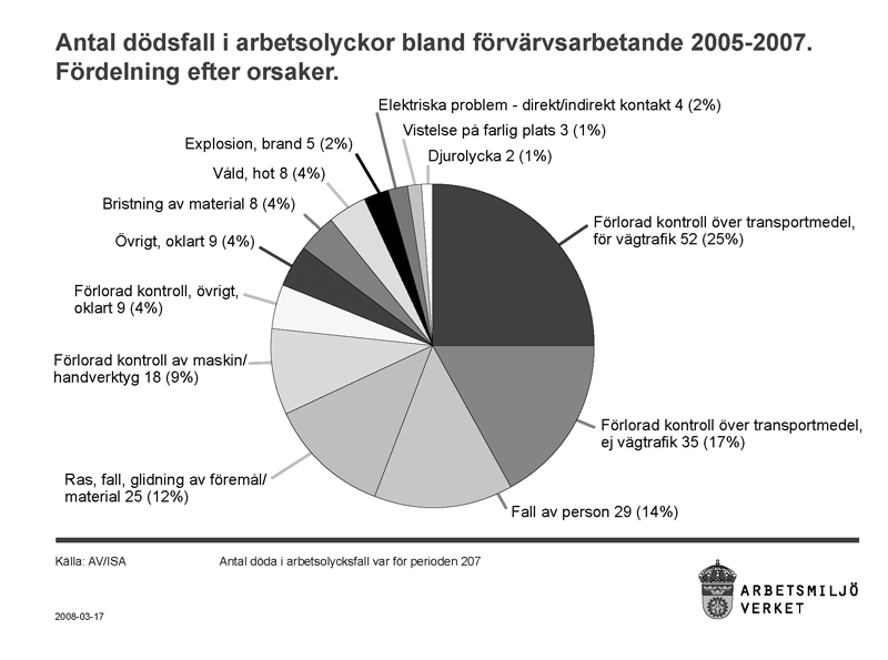 Enligt Arbetsmiljöverket senaste statistisk anmäldes sammanlagt knappt 115 000 arbetsskador under 2006. Av det totala antalet anmälningar svarade kvinnor för 60 000 och män för 54 000. Under 2006 omkom 54 arbetstagare och 14 egenföretagare genom olycksfall i arbetet.