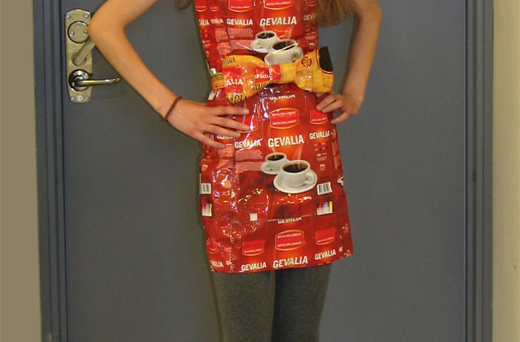 Anna Nygren är 19 år och studerar tyska och franska på Linköpings universitet. Hon har en ovanlig hobby. Hon syr väskor och klänningar av gamla kaffepaket.