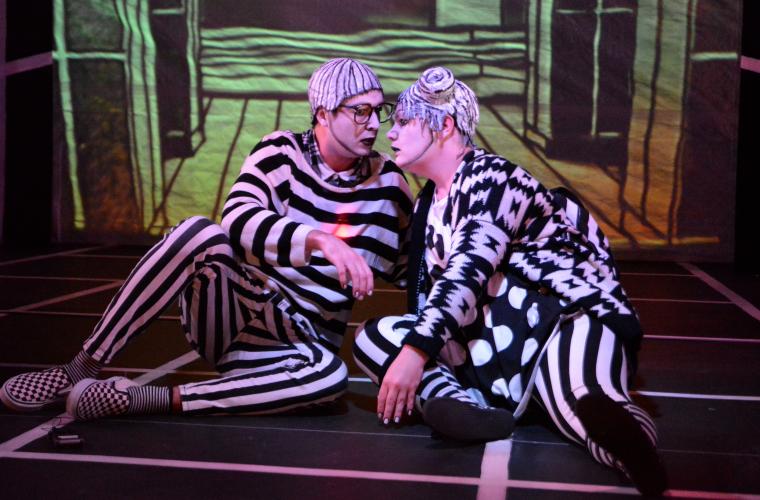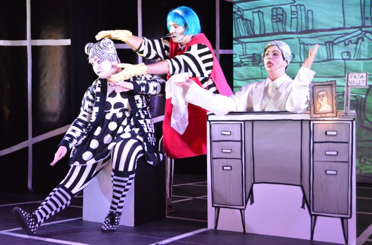 Skådespelarna rör sig som nickedockor i det svart-vita scenrummet. Skolans städerska Hiv-Siv agerar som föreställningens regissör och levererar Freddie Mercury-låtar och förklarande scenpresentationer till publiken. – Fast det får publiken inte säga till hennes chef, för då skulle hen få sparken.
