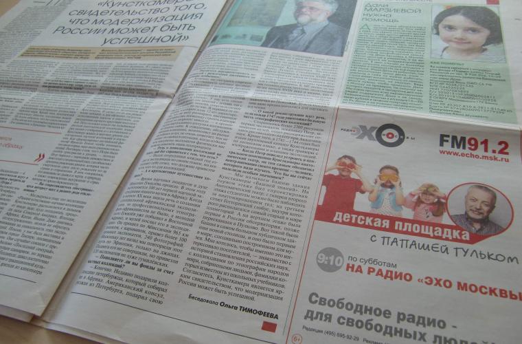 Jag bläddrar igenom 24 sidor text, och hittar en (1) annons. Konstaterar dock snabbt att det inte är något ”vanligt” företag. Annonsen är från den regimkritiska radiostationen Echo Moskvy. Företagen är rädda för problem med myndigheterna om de annonserar i tidningen. Den måste därför förlita sig på sina ägare som får stötta med pengar.