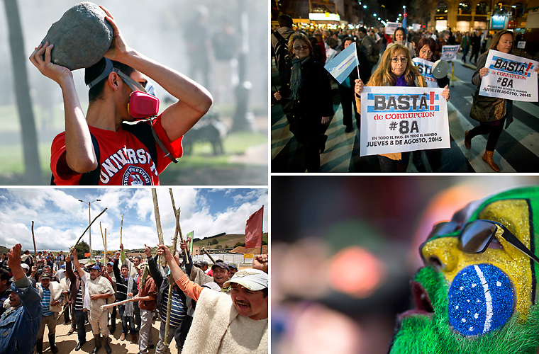 Argentina såg en serie demonstrationer sammankallade via sociala nätverk och begränsade till enskilda datum, senast 8 augusti. Här hade de en ganska klart övervägande höger- och medelklassprägel, även om en del vänstergrupper oppositionella till den sittande center-vänsterregeringen också deltog. Några egentliga krav eller program för manifestationerna fanns inte; parollerna tog upp bland annat inflationen, brottsligheten och korruptionen. Syftet verkar framförallt varit att påverka den offentliga debatten och stämningen i landet och försvaga regeringen. I så fall får de betraktas som delvis framgångsrika; i mellanårsvalet i söndags föll regeringspartiet tillbaka jämfört med förra valet 2011 och oppositionen fick en majoritet av rösterna, fast då bara hälften av parlamentet byts ut behåller regeringssidan en knapp majoritet.
