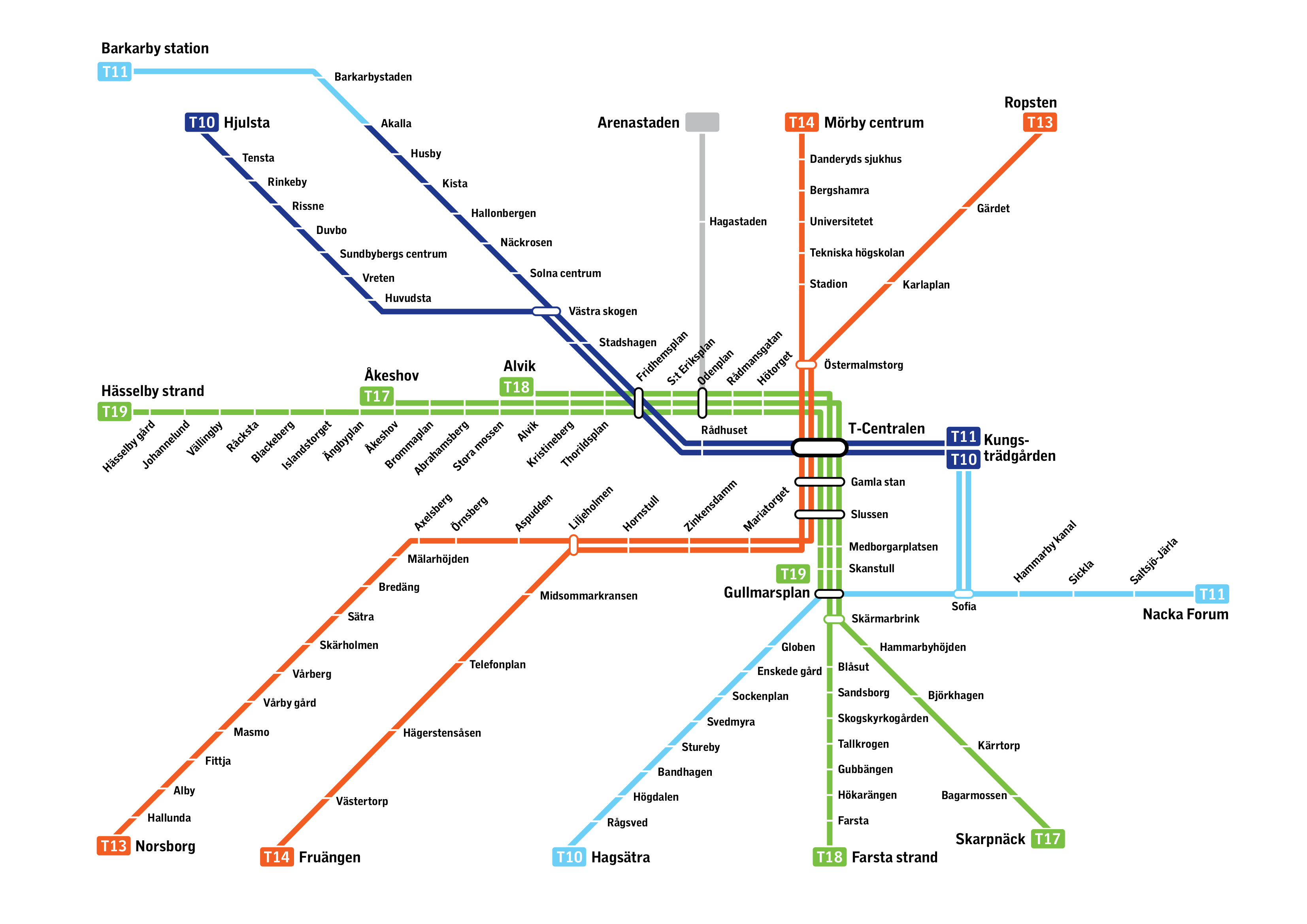 • Dagens gröna linje från Hagsätra till Gullmarsplan förlängs, via den nya stationen vid Sofia, mot Nacka. Hagsätragrenen blir den nya blå linjen.