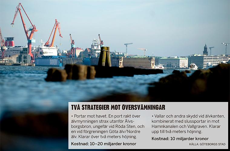 Göteborg klarar en meters höjning hyfsat, men problemet är att vattennivåerna redan nu kan höjas vid extremt väder. Till exempel höjdes nivån med 1,8 meter under stormen Gudrun 2005. Om en sådan storm drar in i Göteborg år 2100 klarar inte staden de då ännu högre havsnivåerna, enligt Moback.