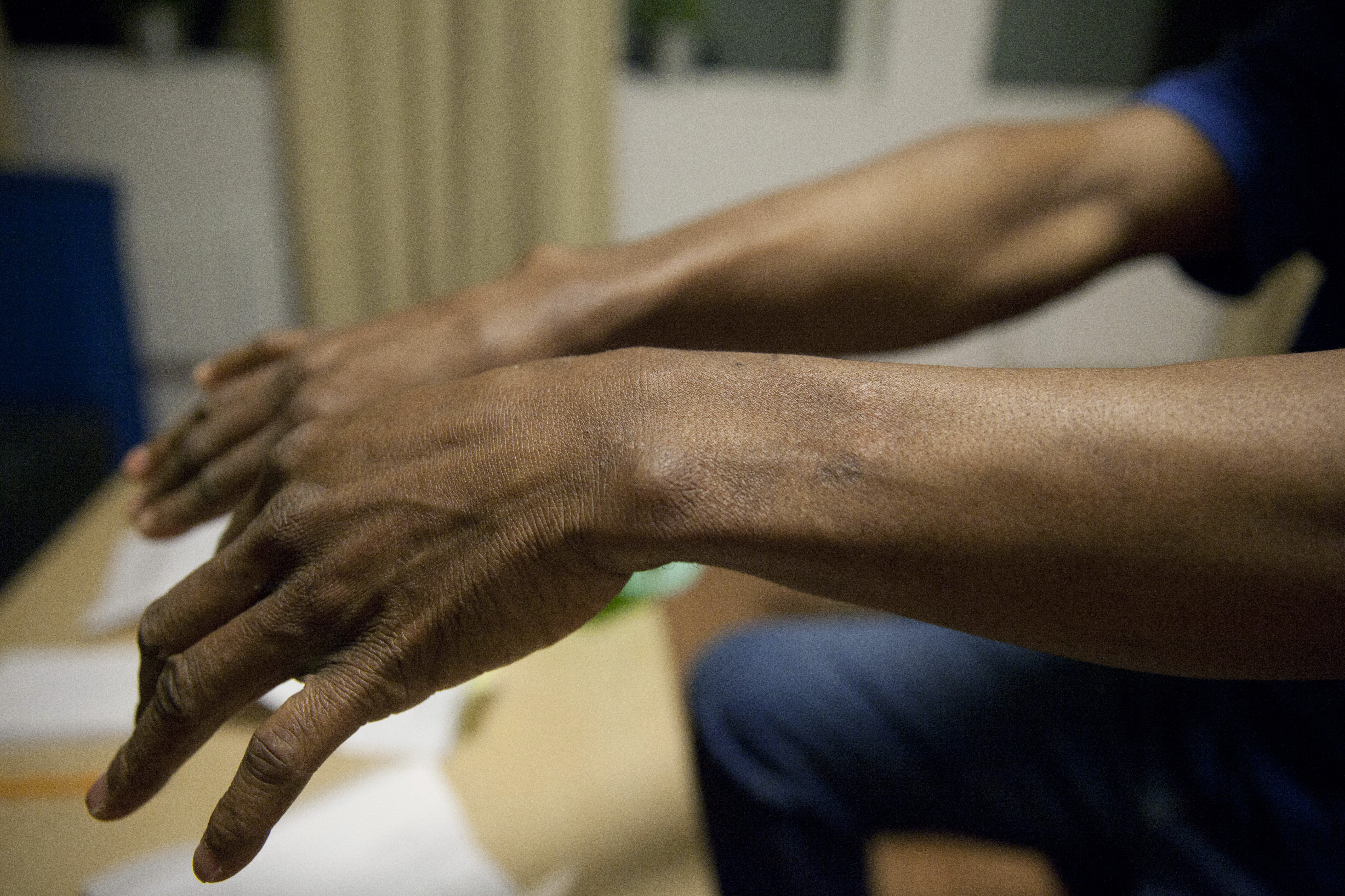 När han rosslar har han fått upp blod. Bröstet värker och han är orolig för sin hälsa. Kring handlederna syns spåren efter handfängsel. Skånes Fria träffar honom på flyktingförvaret i Åstorp där han sitter inlåst sedan det misslyckade försöket att tvångsutvisa honom.