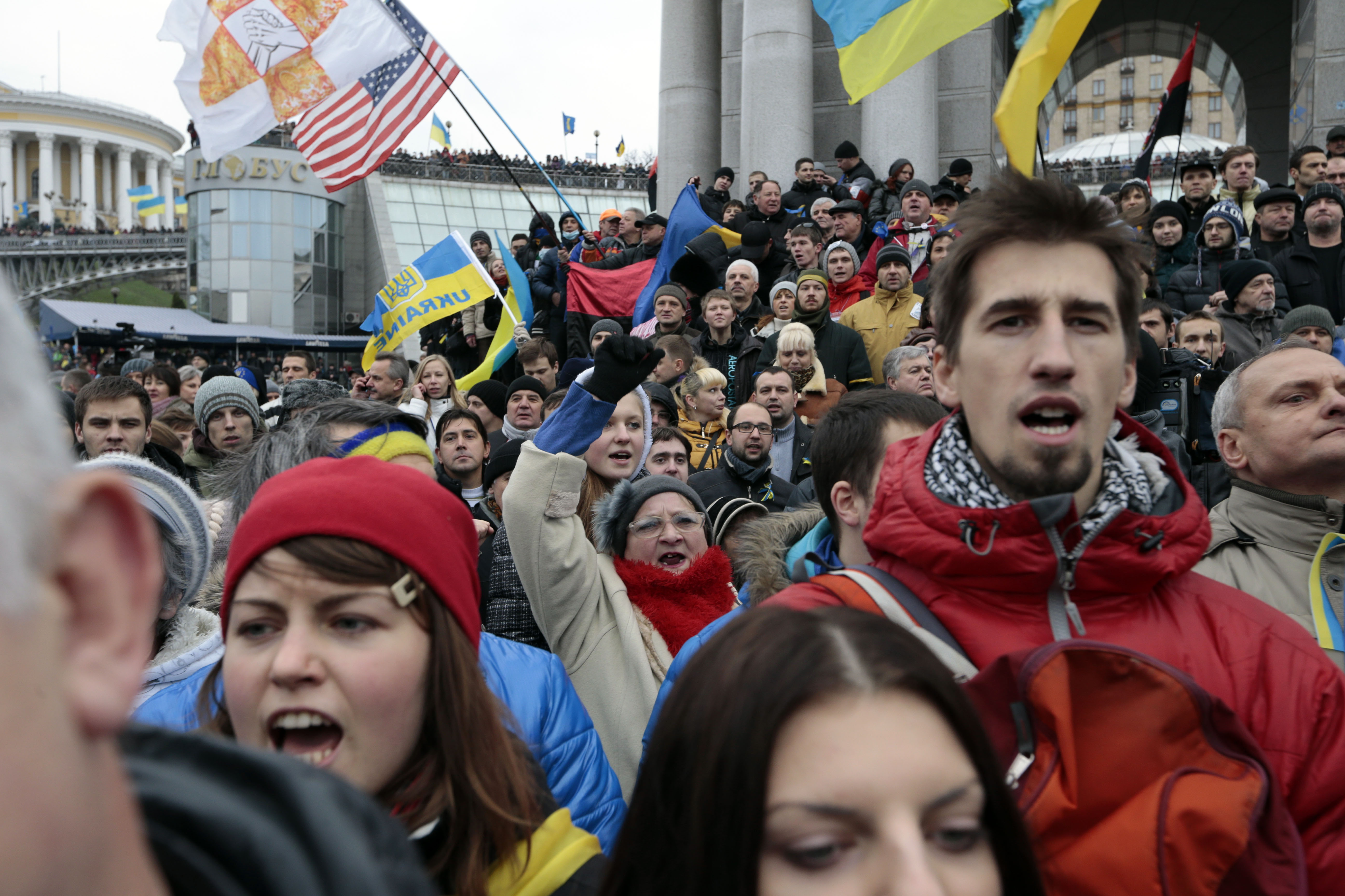 Demonstrationerna samlade inte bara EU-vänliga ukrainare utan utvecklades parallellt till att bli en kritik mot Ryssland med krav på att klippa banden till storebrodern i öst. Att aktivisterna bakom Euromaidan poängterar att det inte finns någon ledare är talande för protesterna, som uppstått utan styrning ovanifrån och samlat vitt skilda grupperingar liksom enskilda aktivister och medborgare. Studenten och vänsteraktivisten Tasja Lomonosova kommenterar de oväntade möten som uppstod: