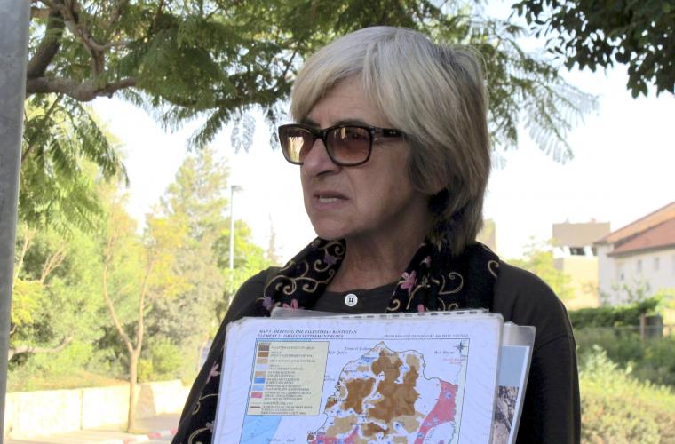 Kvinnan som pratar är israeliska Angela Godfrey-Goldstein som i flera år har bekämpat husrivningar.