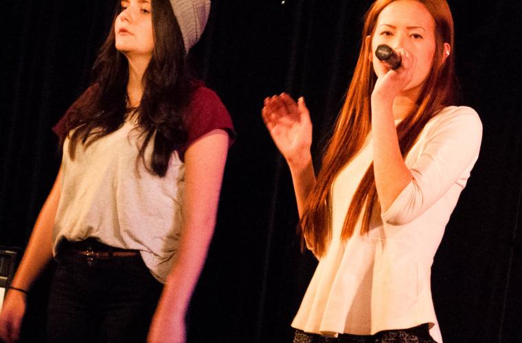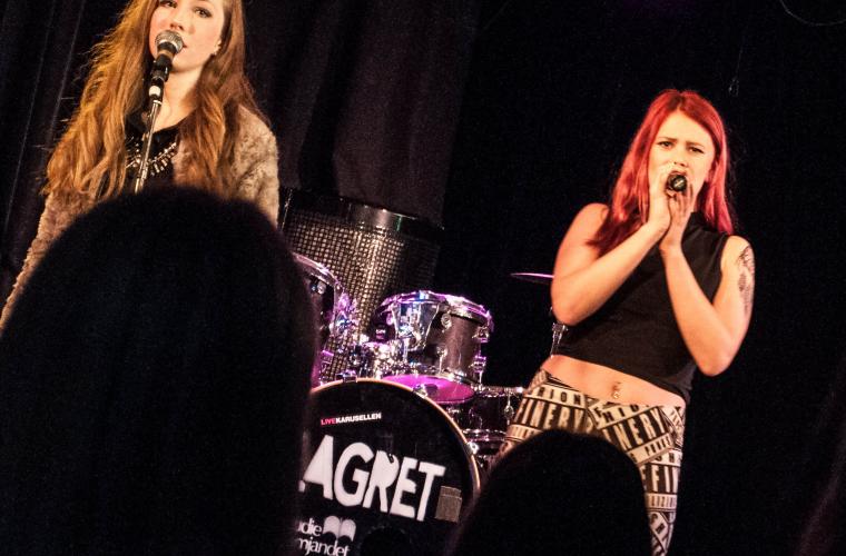 – Nej, vi har inte hunnit repetera med ett riktigt band än. I kväll sjunger tjejerna live till en inspelning, berättar Irya Gmeyner.