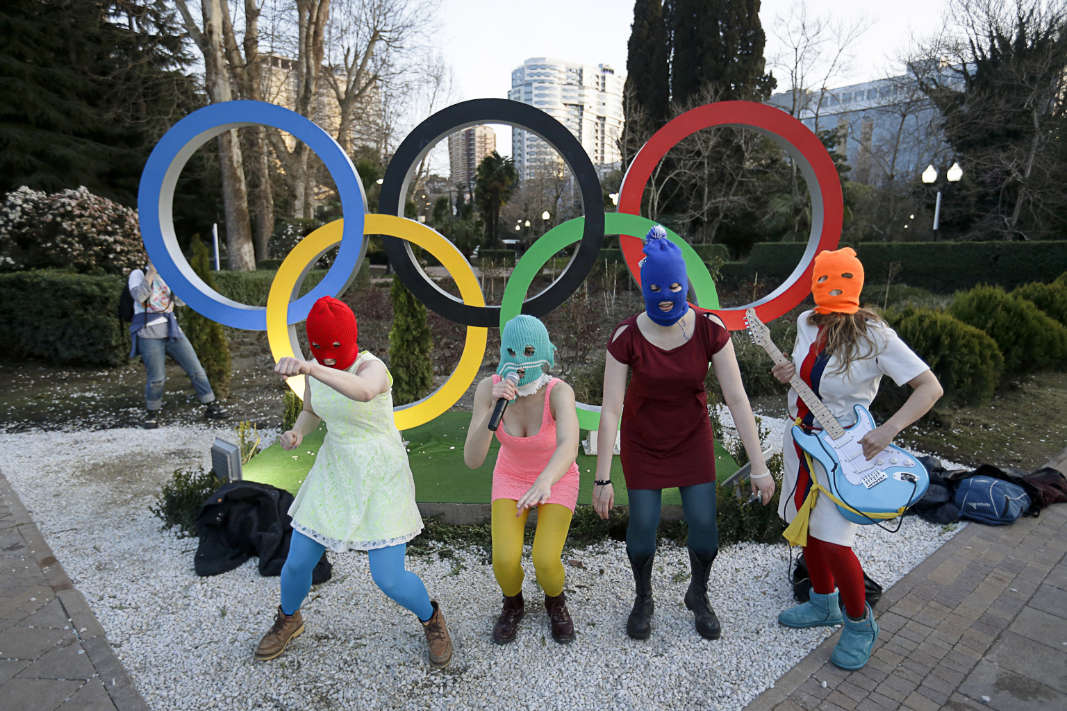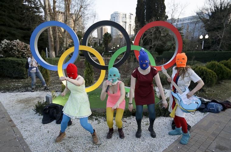 Den ryska regimkritiska performancegruppen Pussy Riot gjorde i veckan ett välbevakat besök Sotji. Aktivisterna, och flera av journalisterna som följde dem, förföljdes av dussintals civilklädda poliser under deras besök i OS-staden och vid minst tre tillfällen fördes de till häktet. När gruppen försökte genomföra deras senaste protestlåt, Putin lär dig älska fosterlandet, utanför en restaurang gick en grupp kosacker till attack med piskor och pepparsprej.