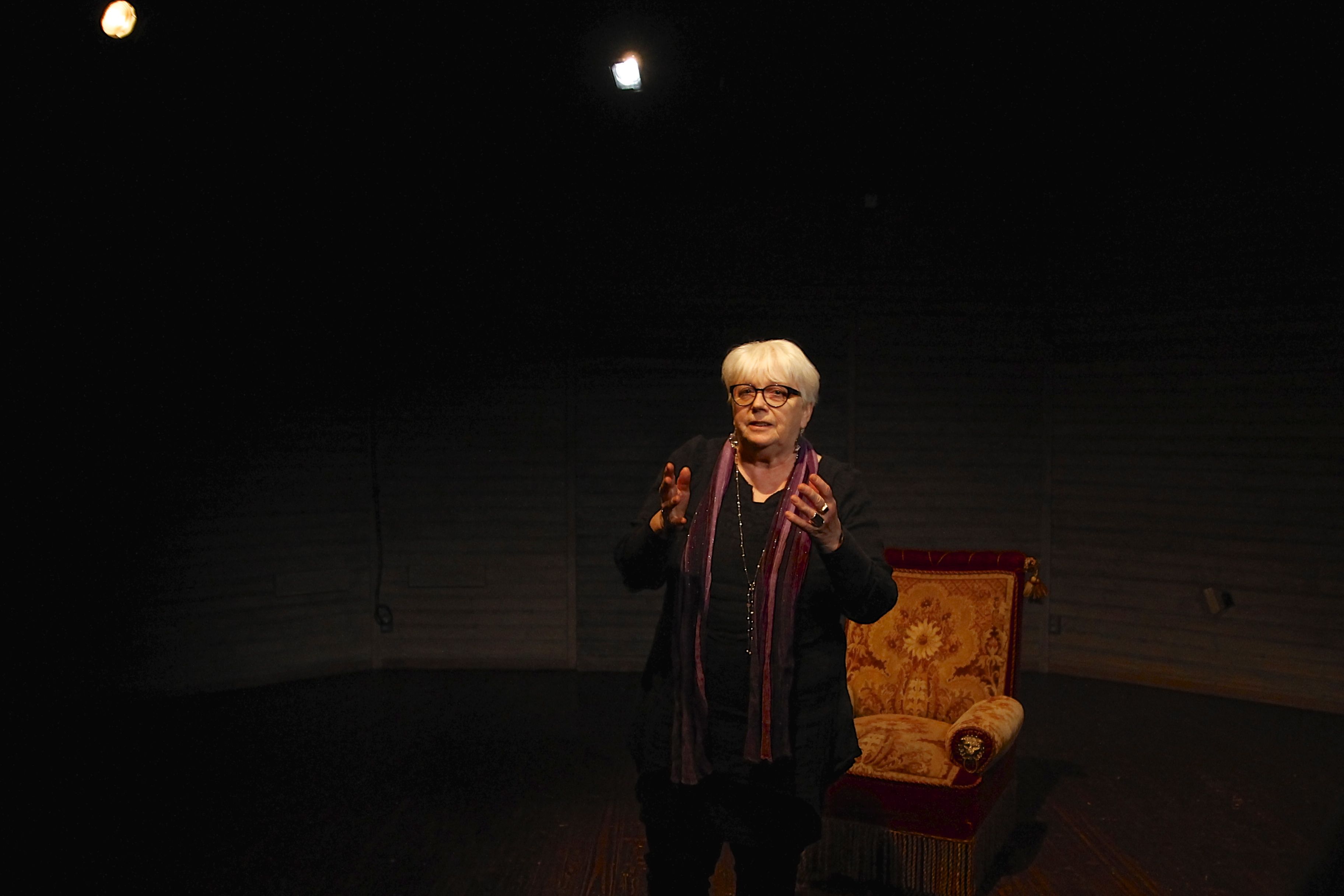 På en mörk scen står en ensam fåtölj. Det är en riktig berättarfåtölj, mjuk och inbjudande och med snirkliga mönster i tyget. Så kliver en kvinna fram och ställer sig vid fåtöljen.