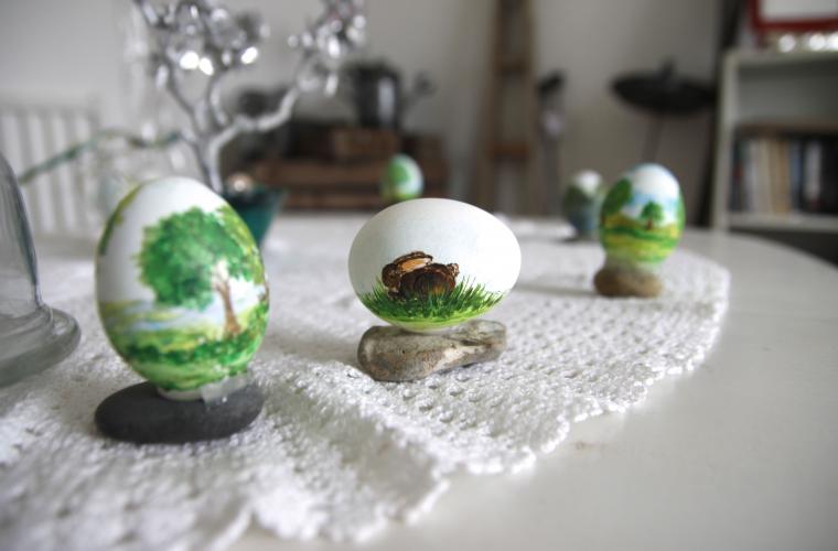 På ett runt bord i det som kallas sagorummet i butiken Ia’s i Hannas ligger en samling urblåsta ägg, fastklistrade på stenar. Varje ägg har små motiv målade på dem, landskap i alla årstider, blommor, små troll och kaniner.