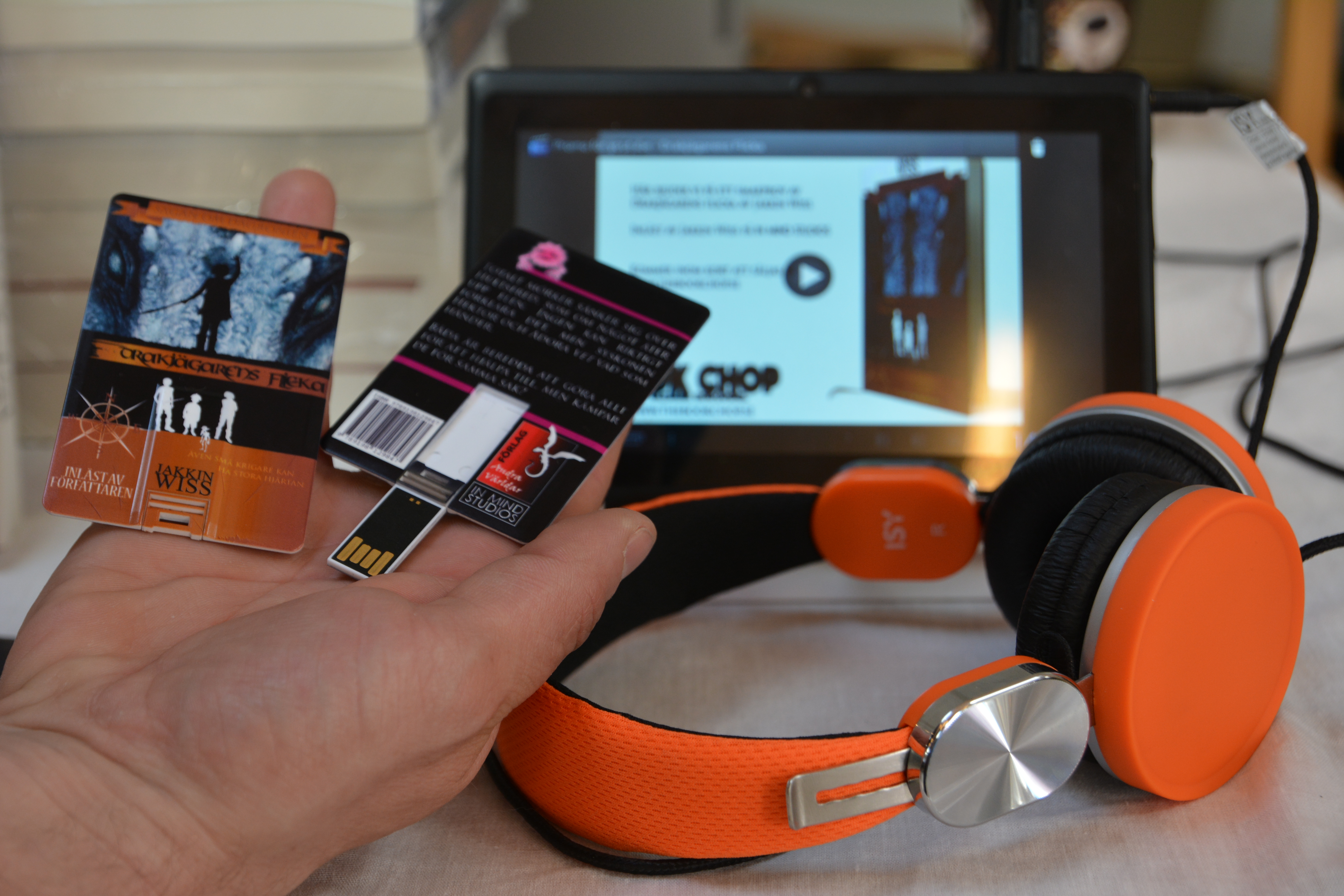 – Det är lite kul att vi är först på marknaden med det här, säger ljudboksproducenten och författaren Jakkin Wiss och visar upp en liten platta i kreditkortsformat med utfällbar USB-sticka.