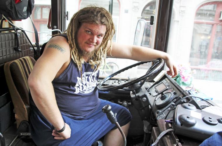 Barfota bänder han upp dörren till turnébussen, som är en gammal landsvägsbuss inhandlad på Blocket, och vi sätter oss ner i ett par slitna soffor i de främre regionerna. Längre bak ligger några av bandmedlemmarna och sover. Vi måste prata tyst så att de inte vaknar, manar Fredrik Boltes.