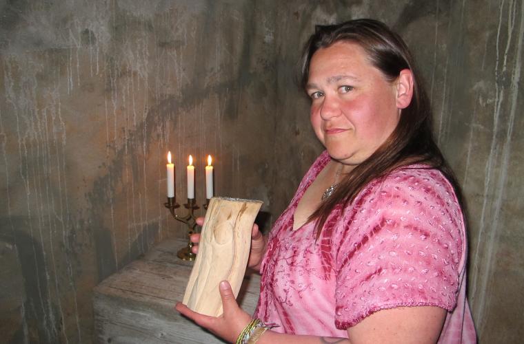 Wictoria Prenell visar en träskulptur som är en del av hennes utställning Crucifying beauty.