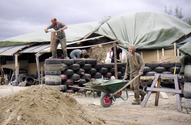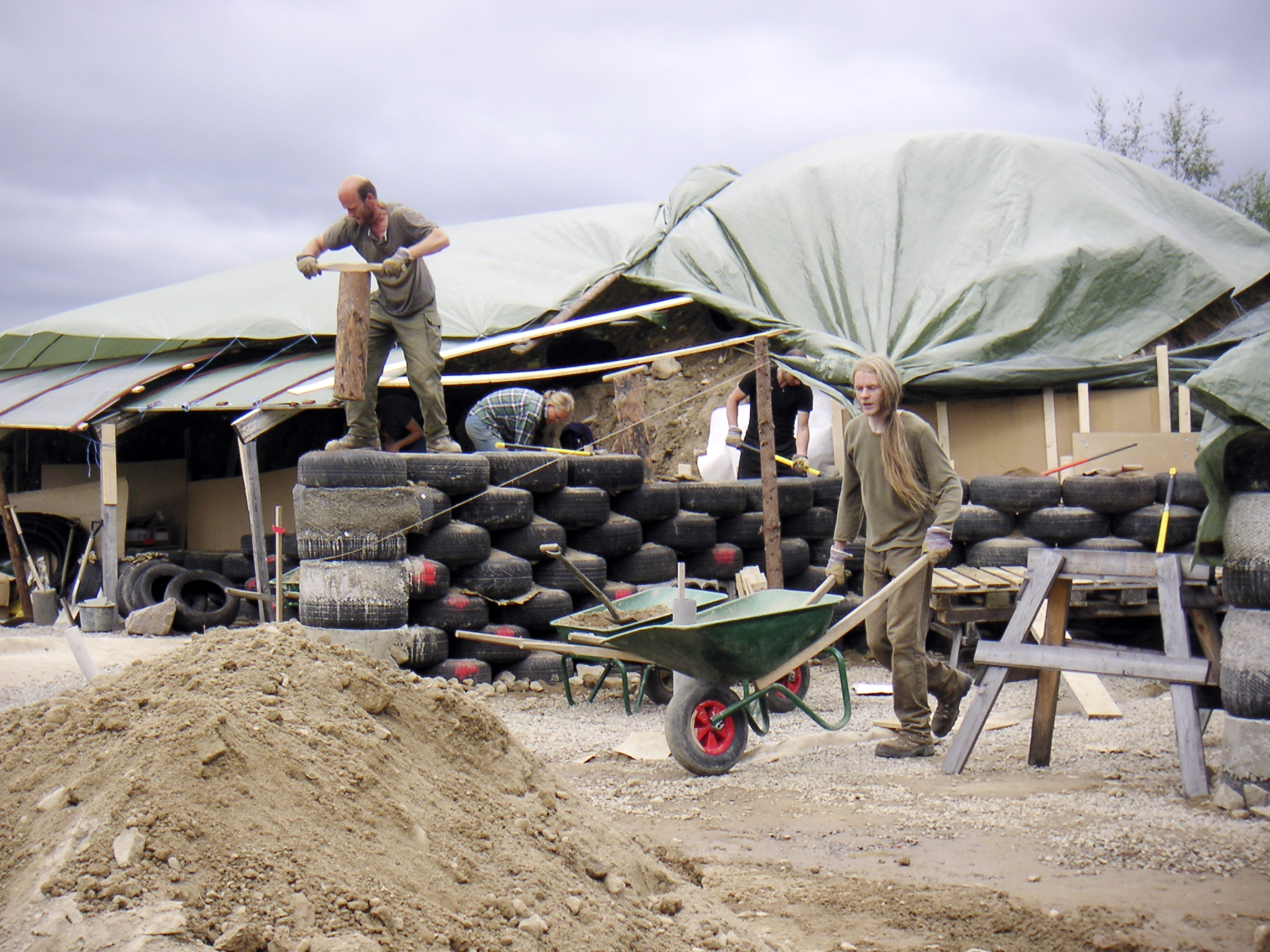 Huset byggs genom att bildäck fylls med sten och grus, vilket packas ihop och blir hårt. Rummens två väggar byggs i form av ett u och kommer ha en öppning mot söder.