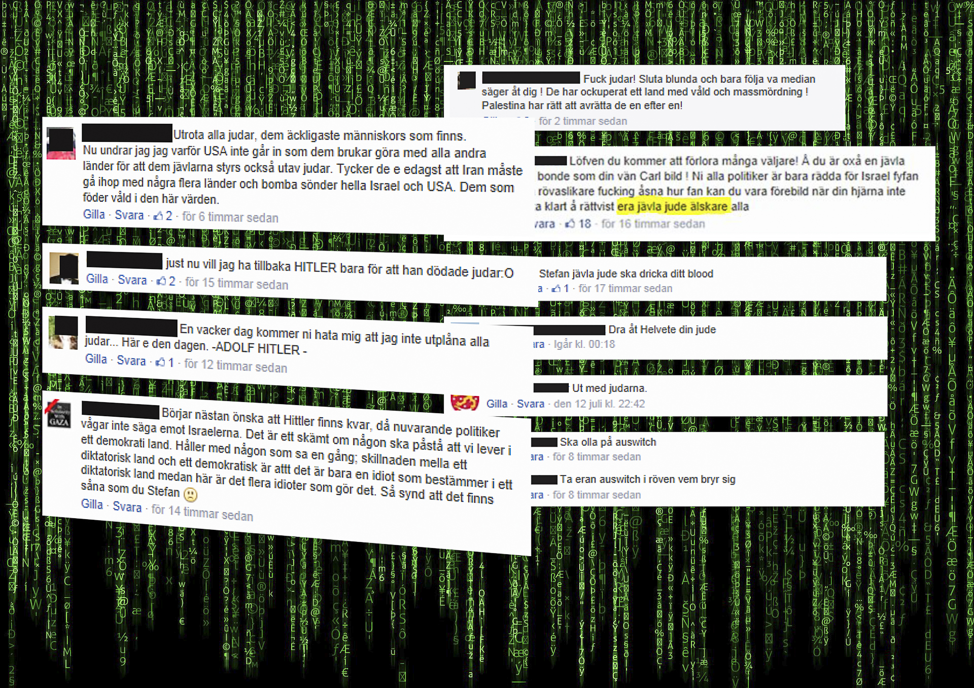 I åtskilliga kommentarer på Stefan Löfvens Facebooksida uttrycks ett öppet hat mot judar, bland annat genom användandet av smädelser som ”judeälskare”, ”judesvin” och ”jävla judar”. I flera fall hyllas Hitler och Förintelsen och uppmaningar till en ny förintelse framförs.