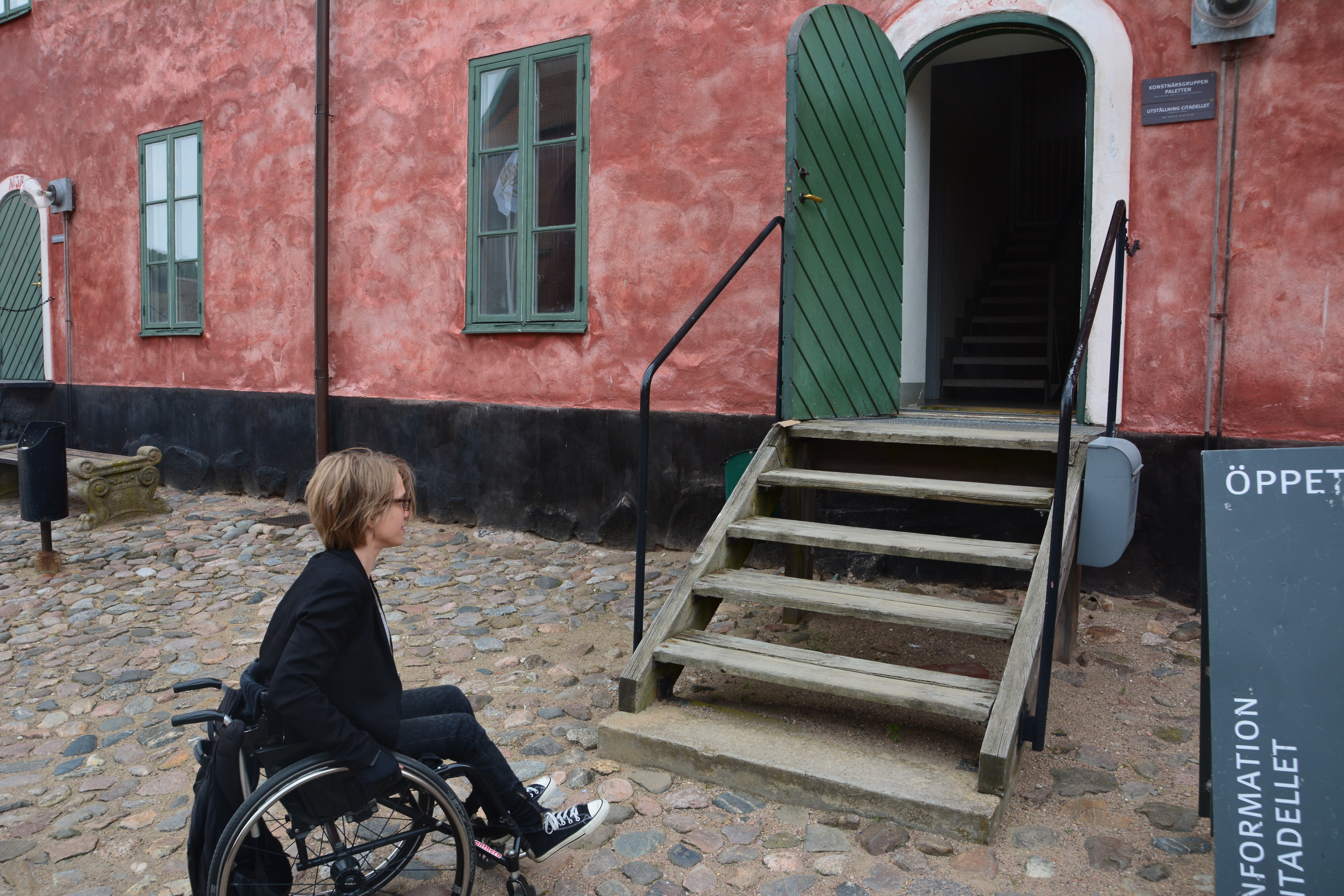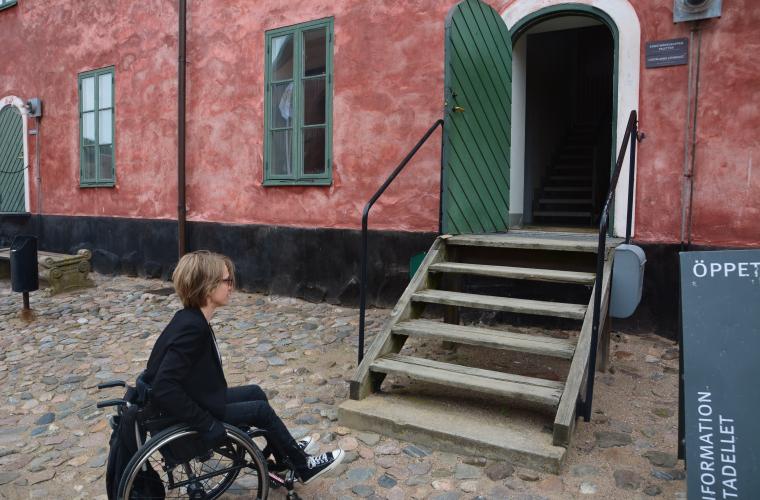 – De hade kunnat tänka mer på att det ska gå att ta sig runt överallt, till exempel hade det varit enkelt att göra en plan gång över borggården eller lägga ut ramper överallt i huvudbyggnaden. Nu kunde jag bara följa med på halva turen, säger Sylwia Gozdek som har testat att komma fram med sin rullstol.