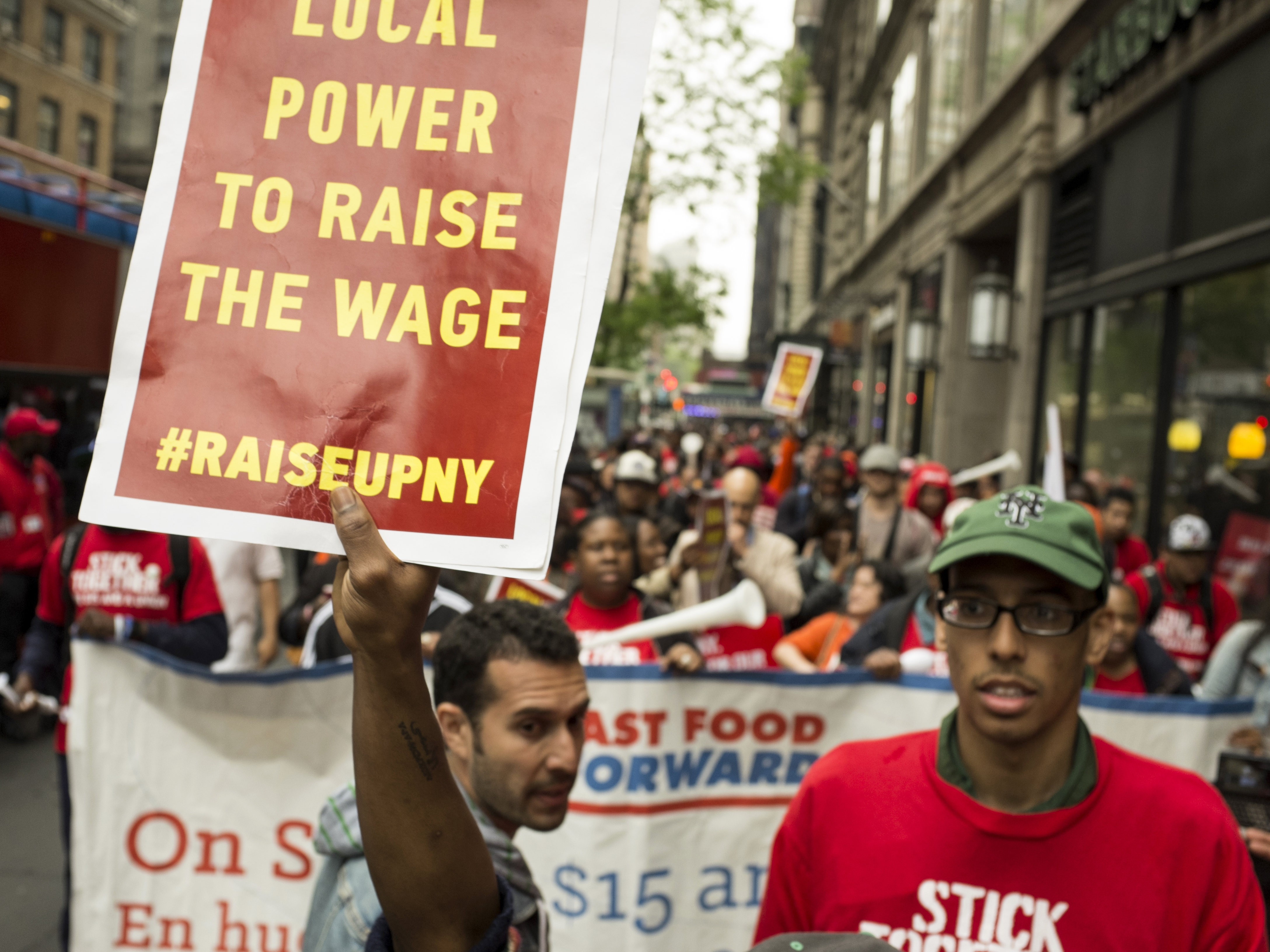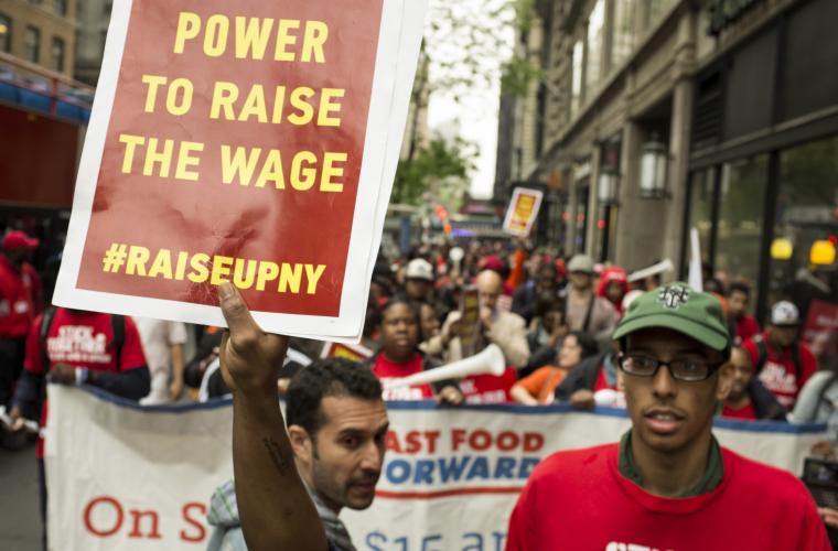 Det är tidig morgon på Manhattan och utanför en restaurang har ett hundratal människor samlats för att demonstrera. Parollen är ”15 and a union” – femton dollar i timlön [110 kronor] och rätten att organisera sig.