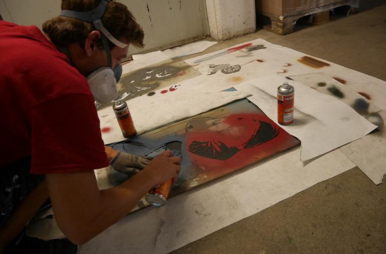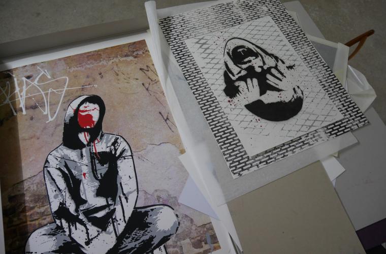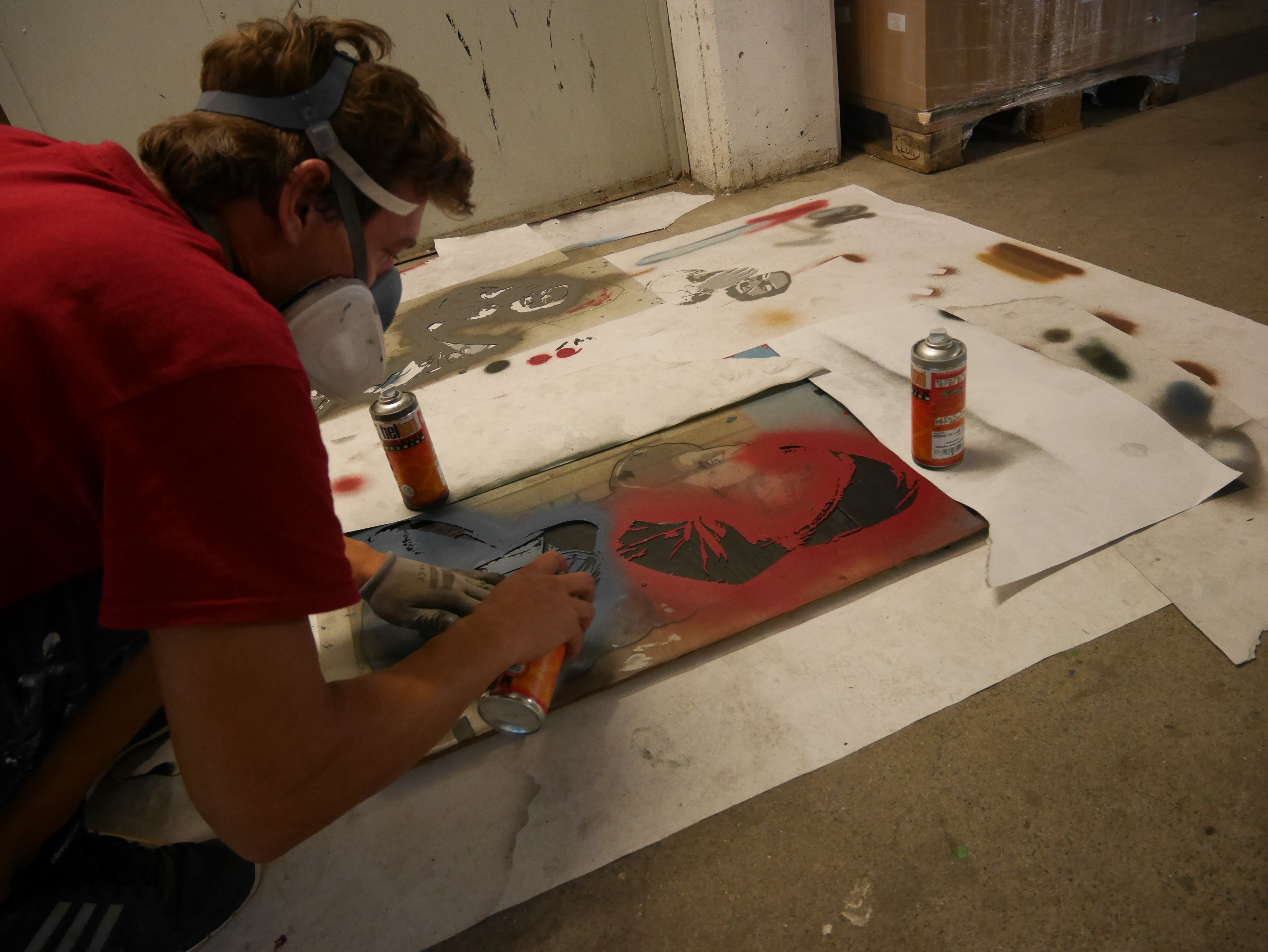 – Jag jobbar långa stunder i studion med stenciler. Sprejar och gör färdigt på papper, för att sedan ge mig ut med klister och en bunt affischer. Det är skadligt att jobba så mycket inomhus och jag har tröttnat på monotonin med paste ups. Efter den här utställningen ska jag arbeta mer ute, direkt med färg på väggarna.