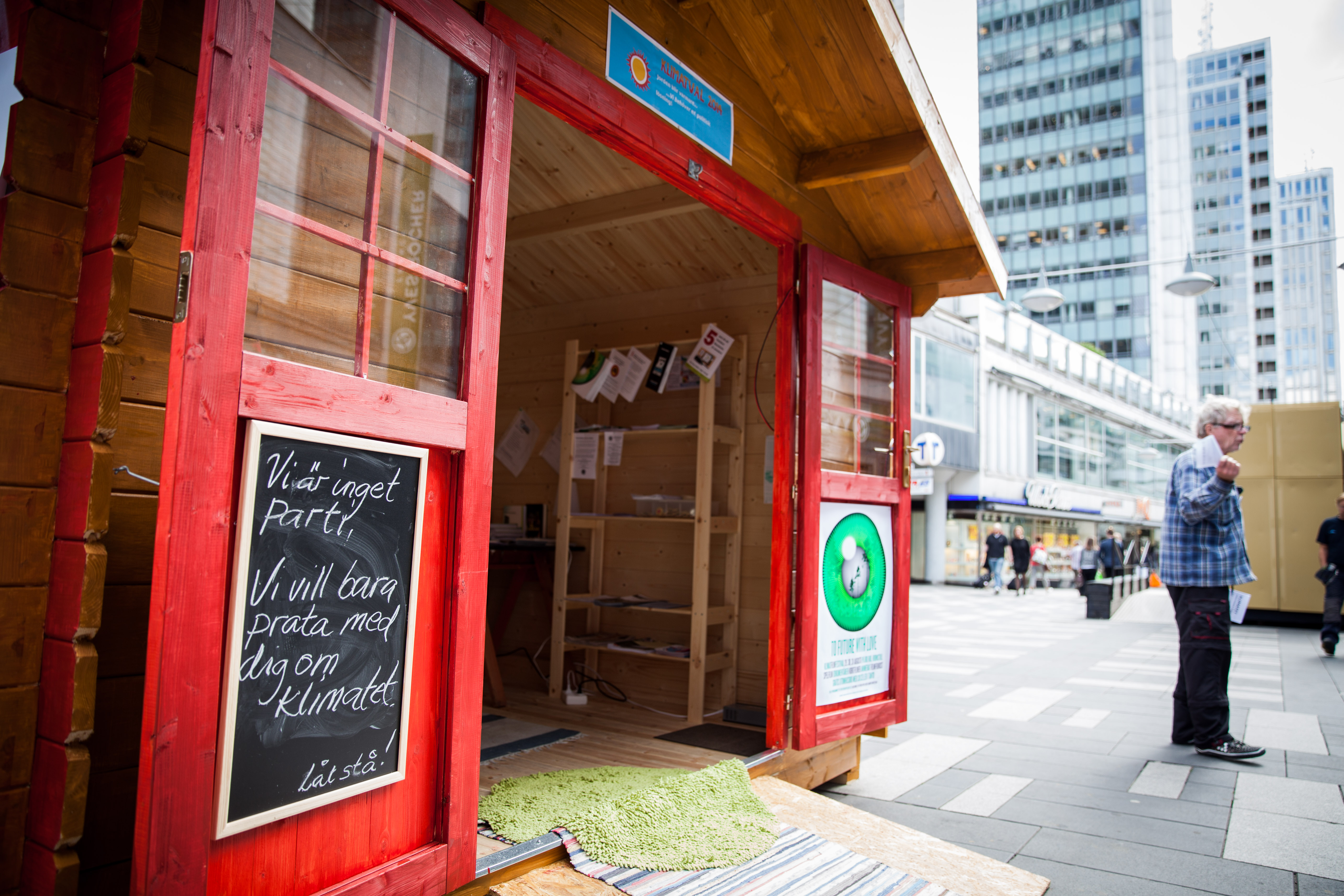 Partiernas valstugor står samlade på Sergels torg. Men drygt hundra meter upp Sergelgatan går det att hitta en alternativ valstuga. Det är miljörörelsen som driver valkampanj för klimatet.