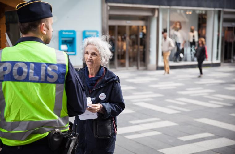 Hon fortsätter dela ut flygblad när en polis närmar sig.