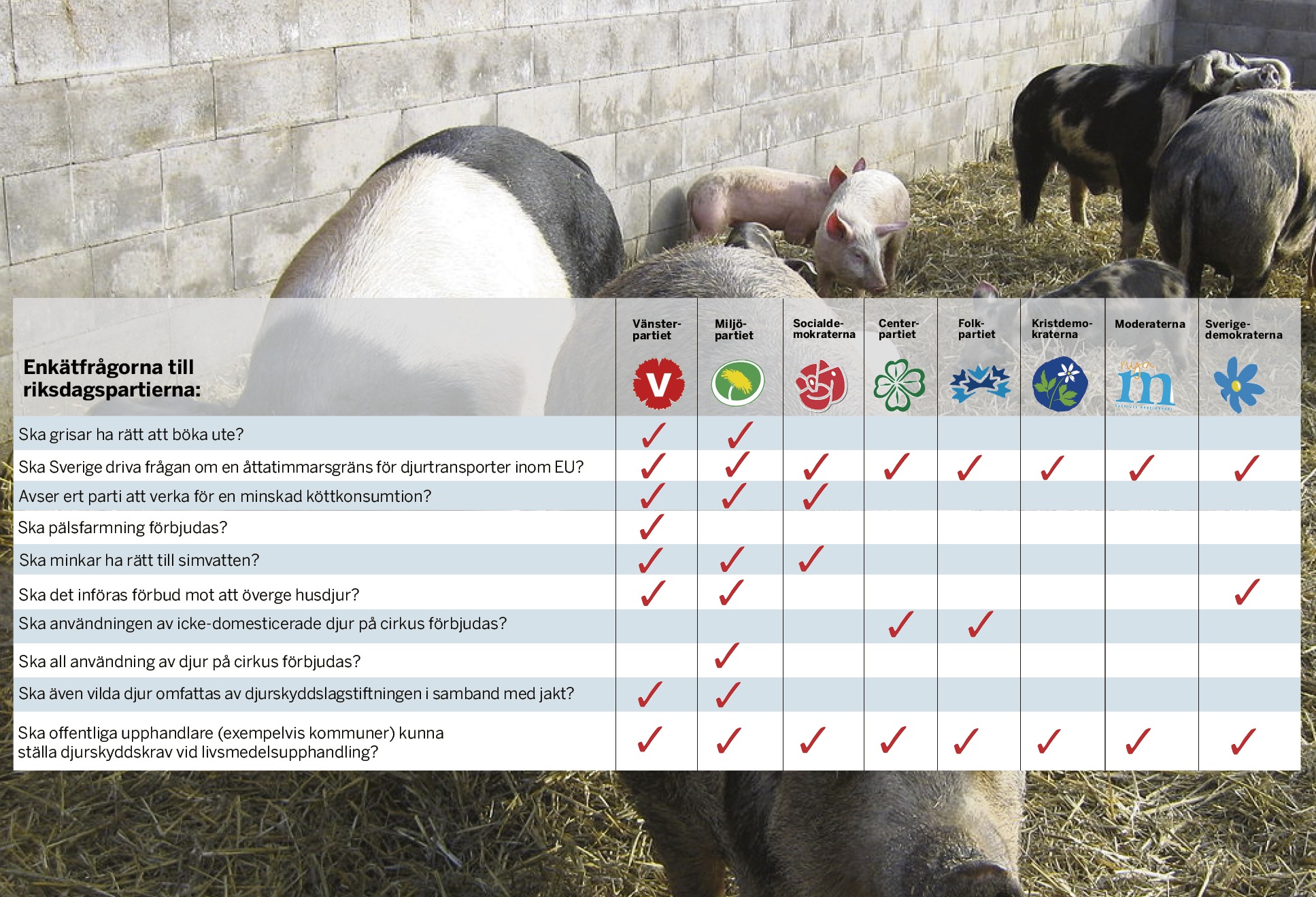 Utifrån resultaten rankas Vänsterpartiet och Miljöpartiet som djurvänligast. De är exempelvis de enda partier som vill ge grisar laglig rätt till utevistelse.