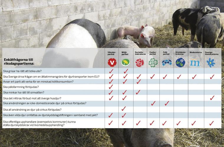 Resultaten i riksdagsvalet kan vara avgörande för många av de djur som lever i Sverige. Det visar Djurens rätts enkätundersökning, där samtliga riksdagspartier svarat på en rad frågor som rör djurens situation.