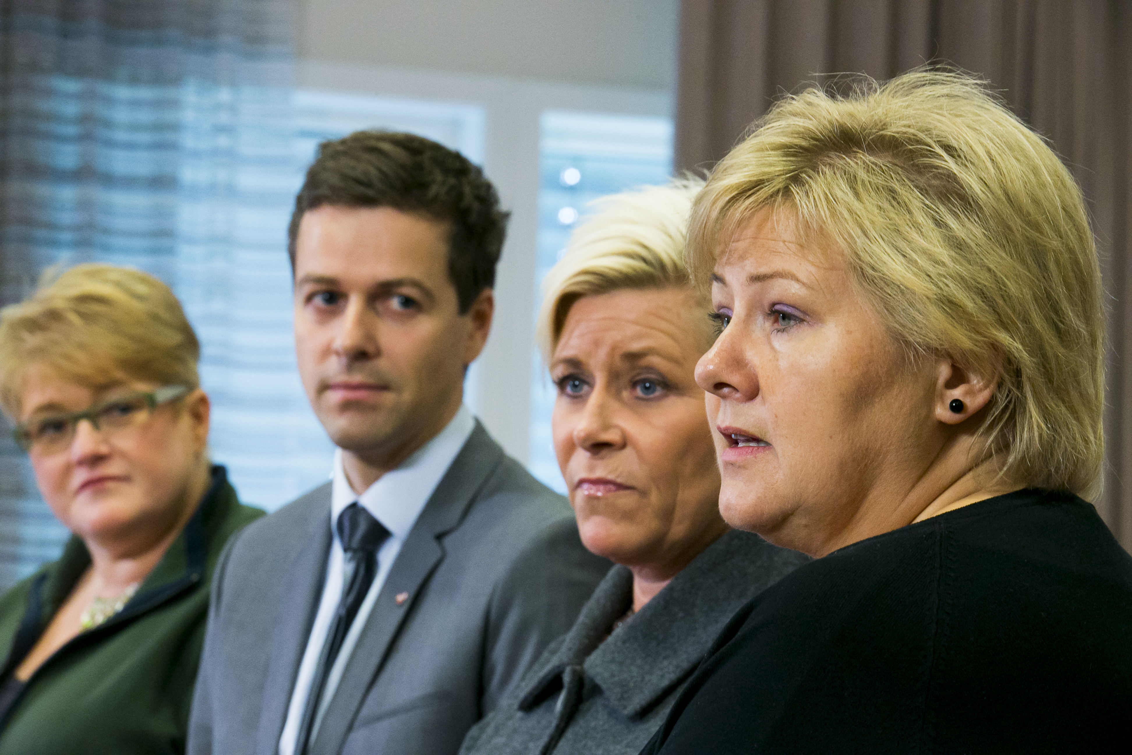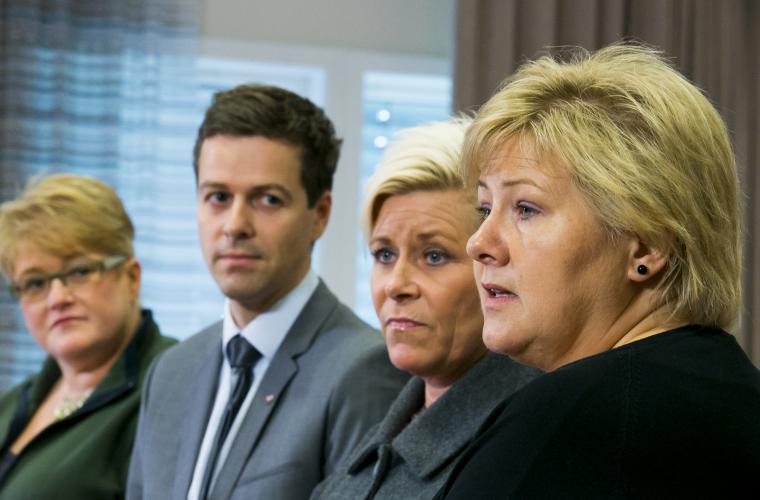 Utvecklingen gick snabbt – från att den nuvarande statsministern Erna Solberg, konservativa Høyre, fyra år innan valet 2013 såg det som otänkbart att regera tillsammans med Fremskrittspartiet till att partierna nu styr landet ihop. FrP innehar 7 av de 18 ministerposterna i regeringen. Folkpartiet Venstre och kristdemokratiska Kristelig folkparti ville inte sitta i regering med FrP men skrev samarbetsavtal.