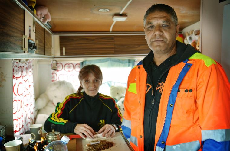 På tältplatsen står Mijloc. Han är kall och modstulen. Dagens jobbjakt har inte gett något. Han längtar hem. Nu är målet att inom en månad samla ihop pengar till bussbiljetten tillbaka till Rumänien. Han plockar upp mobiltelefonen ur fickan och lyfter den mot örat för att visa.