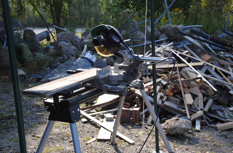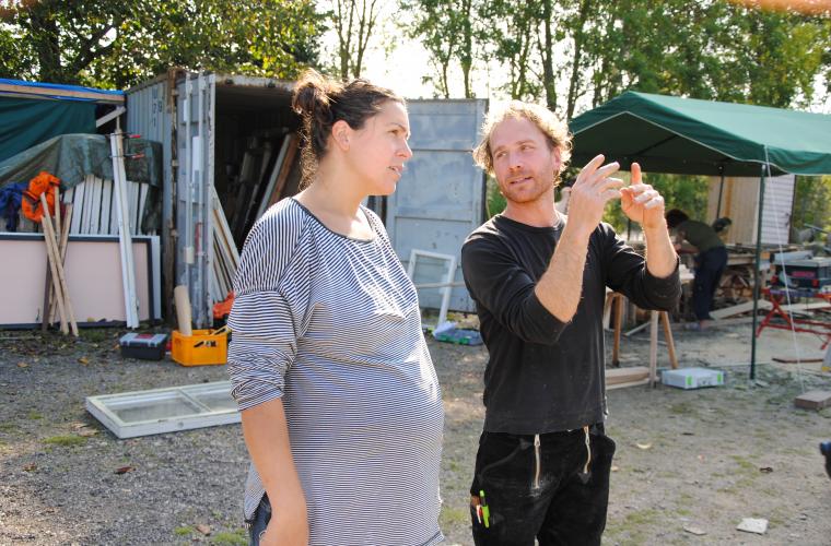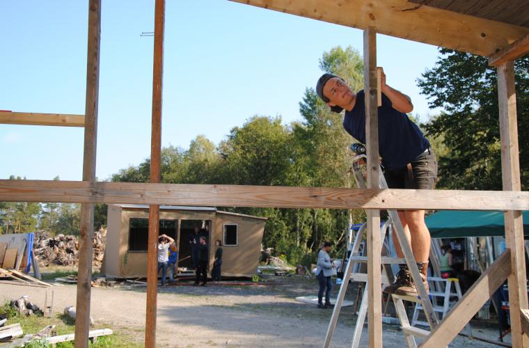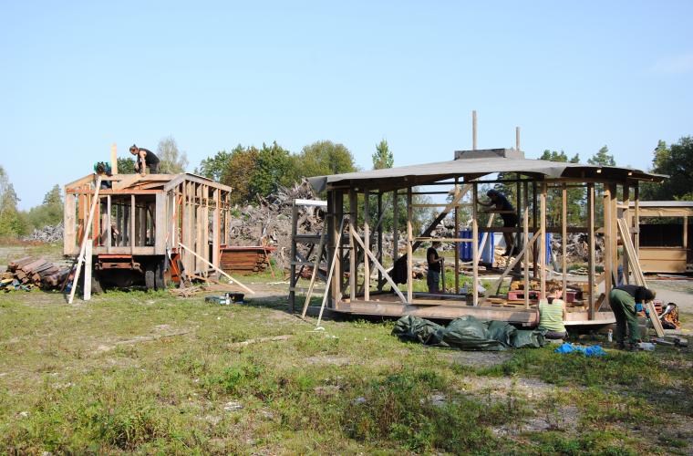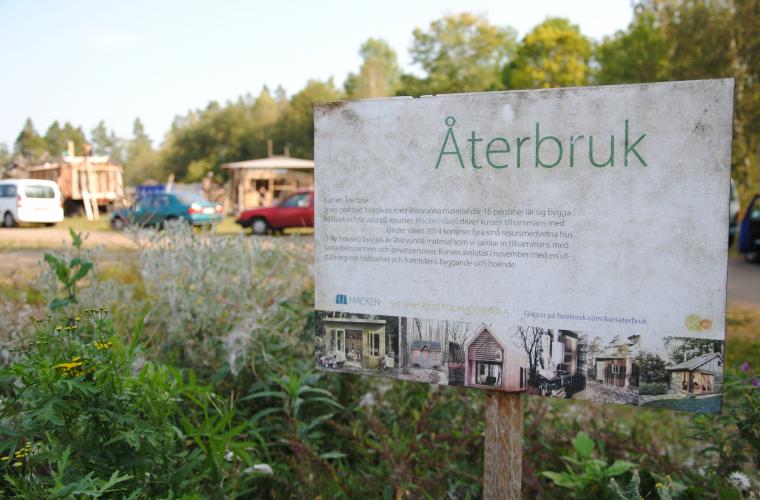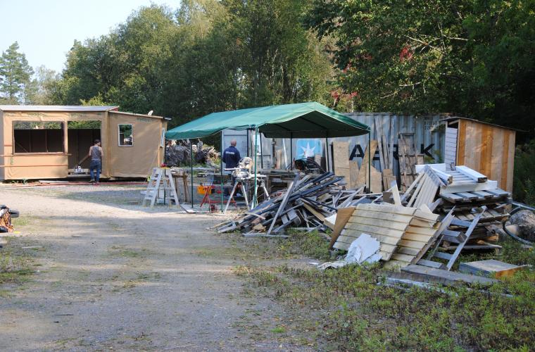 På Norremarks industriområde i norra Växjö är det full aktivitet. Tre hus håller på att byggas av återbrukat material. Under ett tak står sågar och andra maskiner uppställda, i en container ligger skänkt virke och deltagarna varvar mätande, sågande och hamrande med diskussioner kring nästa moment.