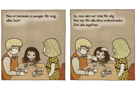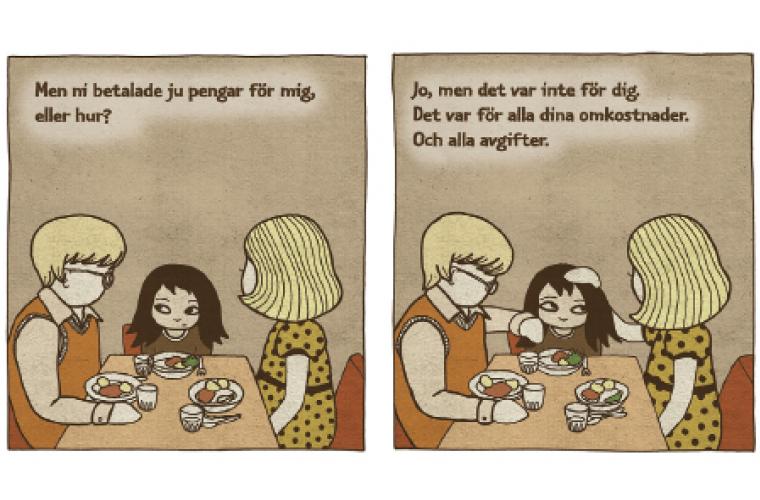 För Lisa Wool-Rim Sjöblom har illustrationer och framför allt serier blivit ett sätt att uttrycka kritik mot adoptionsindustrin. I senaste numret av Bang har hon tecknat en bild av en socialarbetare som spelar roulette med barns dokument för att förvandla dem till föräldralösa och adopterbara genom att radera ut deras bakgrunder. Och i en kommande antologi från Dotterbolaget har hon med en serie om hur hon började granska sin adoption.
