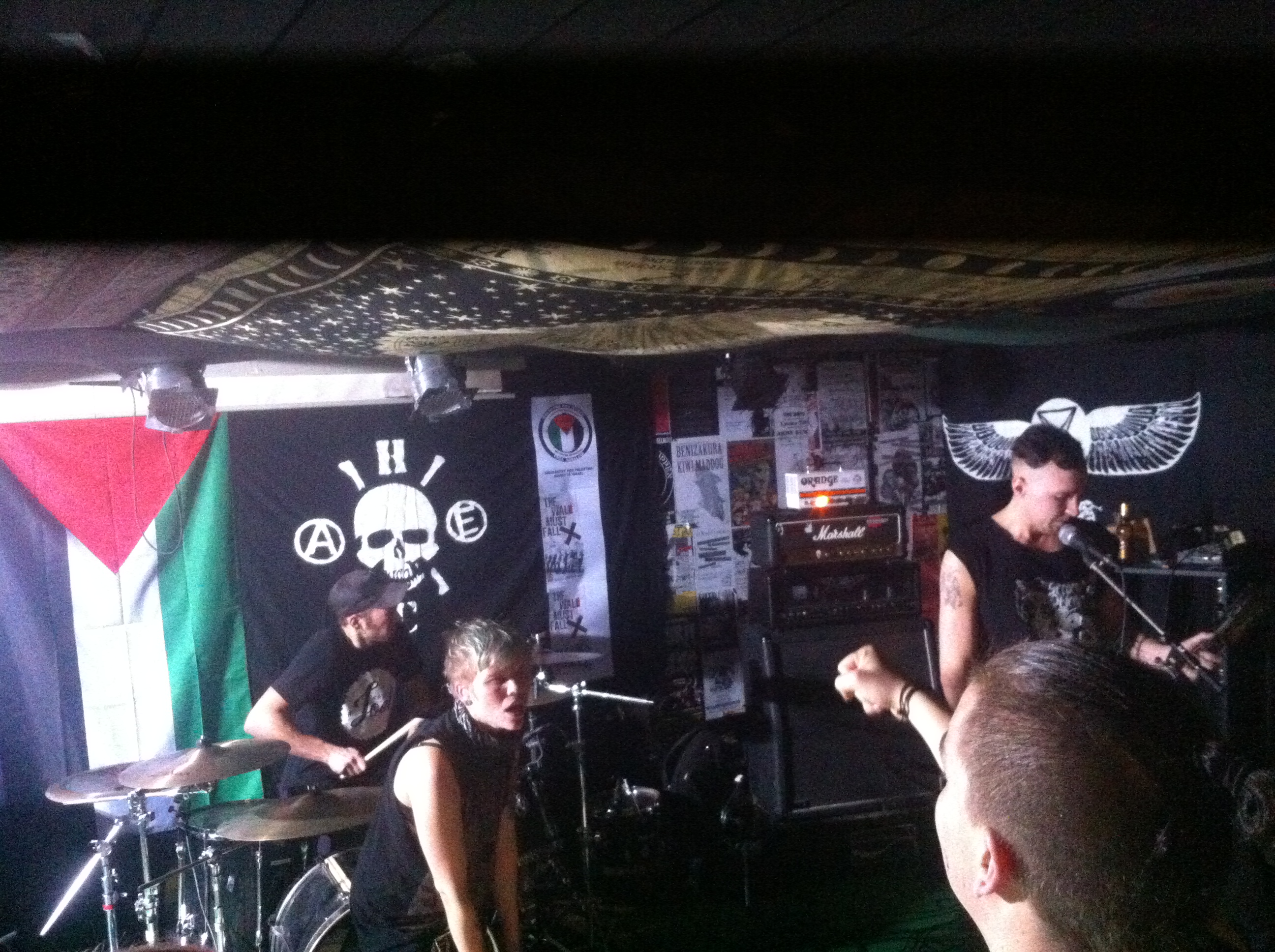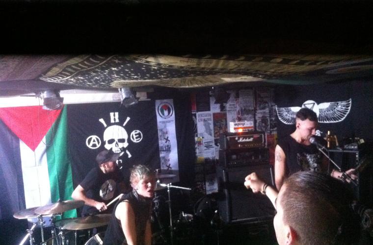 Verkets lokaler bär punksfärens alla kännetecken, med svarta väggar täckta av spelningsaffischer i spellokalen, grafitti och slagord målade på väggarna, och väggen bakom scenen har kvällen till ära prytts med en Palestinaflagga.
