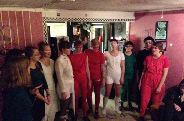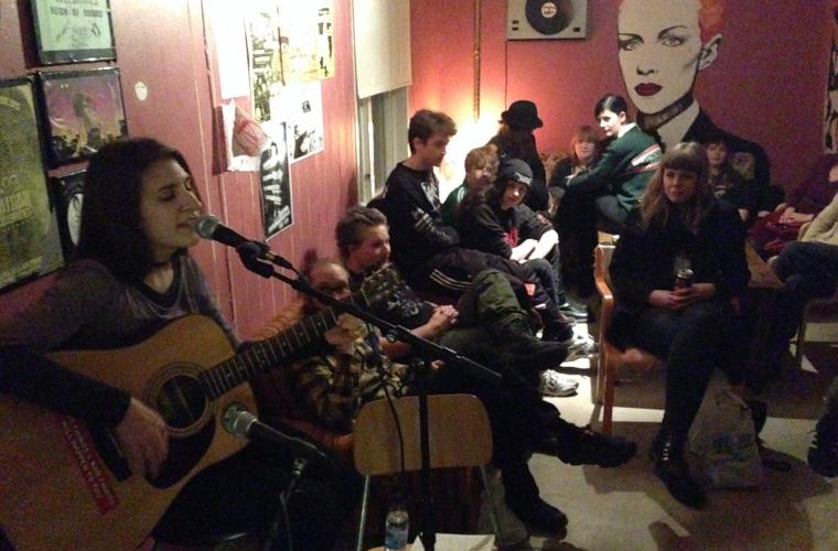 Den första musikakten för kvällen är Umeå indiekör, som iförda färggranna kläder och frikostiga sminkningar bjuder på välkända pophits. De avslutar storstilat med Whitney Houstons I wanna dance with somebody, och därefter tar singer/songwritern Julia Hariz plats i kaféet, och levererar självsäkert låtar allt medan ett gäng volontärer steker vegetariska hamburgare vid spisen bakom baren intill. Ett bord därinne bågnar av hamburgerbröd och tillbehör, och oset från burgarna genererar en strykande åtgång. Vid denna upplaga av Hardcore mot muren skänks allt överskott till den israeliska aktivistgruppen Anarchists against the wall, vilka samarbetar med palestinier i syfte att motverka muren på Västbanken.