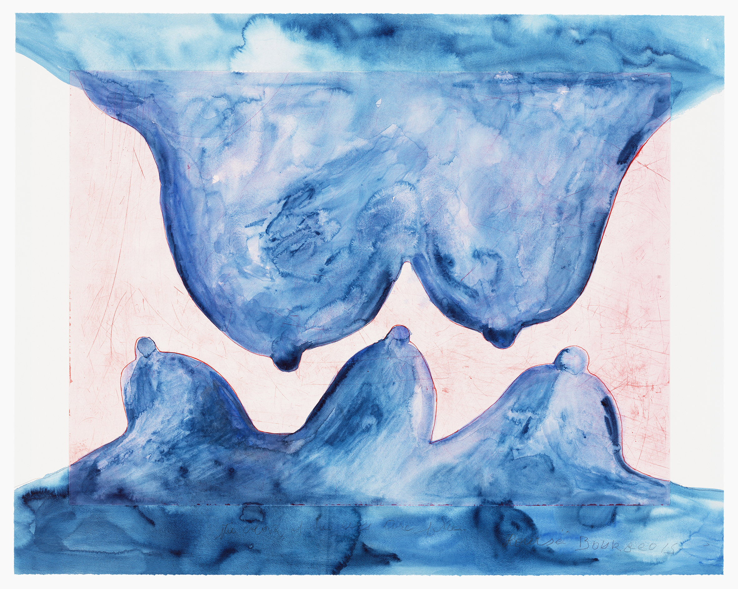 Louise Bourgeois liv och yrkesliv var långt, hon gick bort 2010 i en ålder av 99 år. Det är fascinerande att i en och samma person bevittna nästan ett sekel av konst och konsthistoria. Hon är i första hand skulptör men de flesta konstformer finns närvarande i hennes arbete, inte minst ordet. Från anteckningar i marginalen på de tidiga teckningarna till Sois bien calme från 2003, där Bourgeois med rödpenna skrivit som ett mantra på ett notblad: ”var lugn, lugn, bara lugn”.