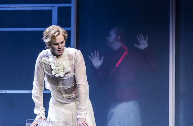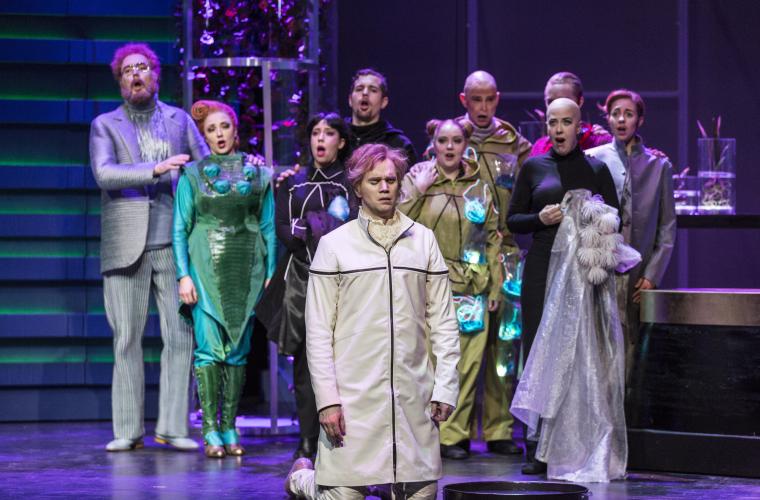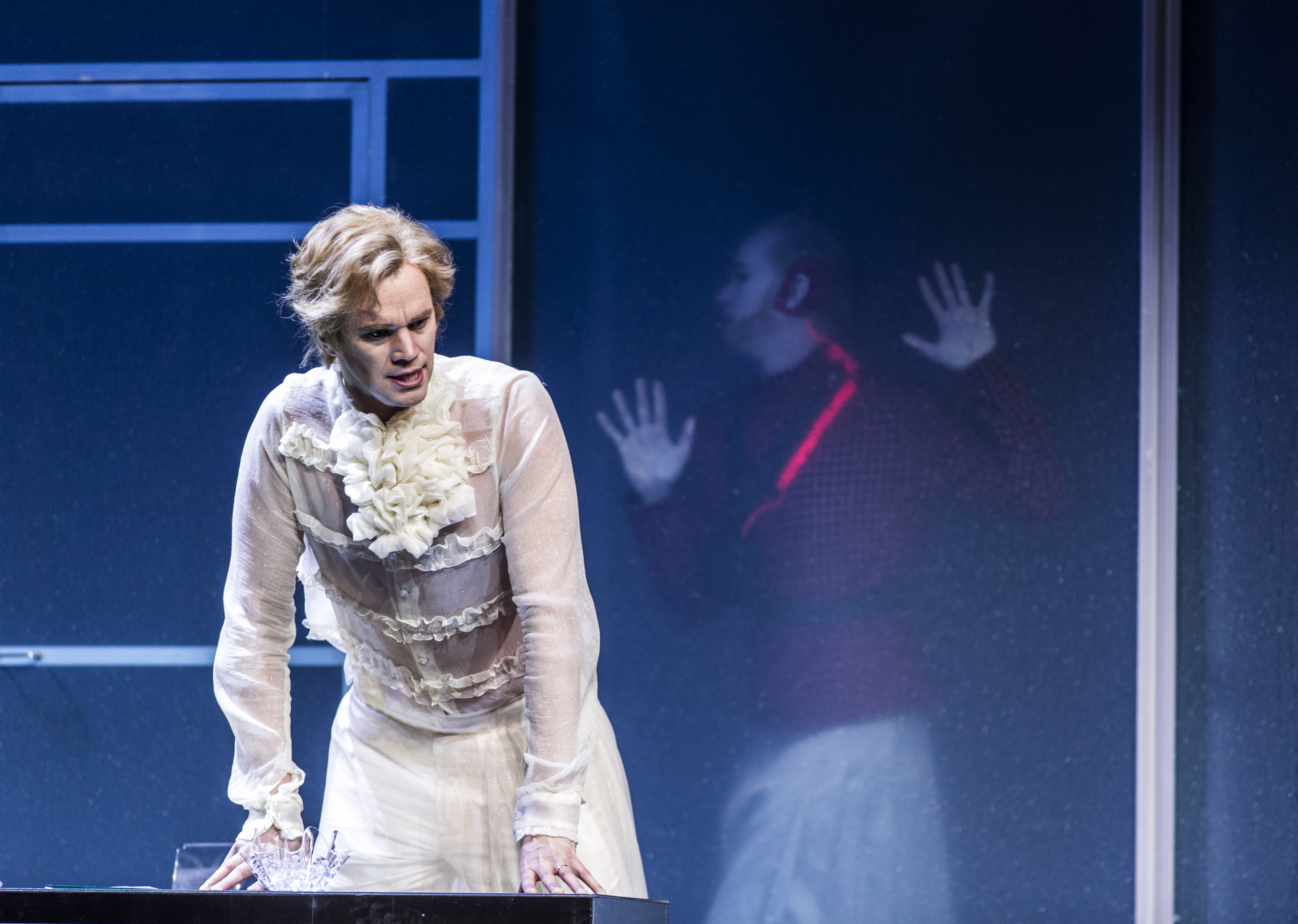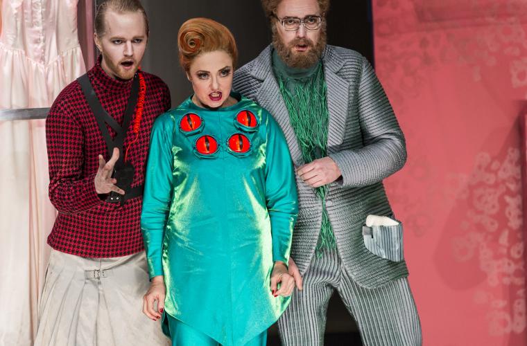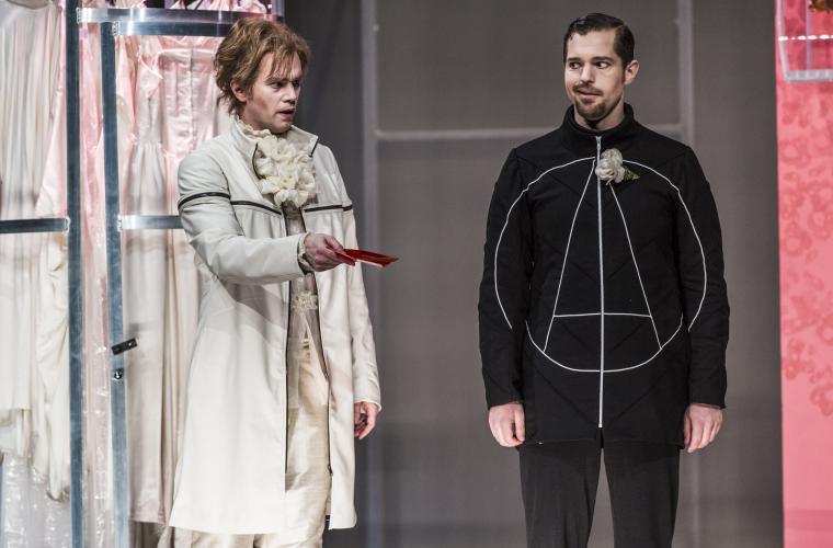 Första akten spelas utan att jag rycks med i handlingen, men redan under andra akten har intrigen tätnat och det är underhållande på alla sätt. Förtjusande versrader och många spetsfundigheter vinner publikens skratt. Musiken som är dirigerad av Tobias Ringborg träder ibland fram, framför skådespel och sång. Scenografin är futuristisk, och innehåller bland annat projicerade videobilder med sceniska motiv som för att förstärka grevens herravälde, som tycks allt mer osäker under intrigens gång. Den till synes rakryggade greven sjungs av baryton Carl Ackerfeldt. Anna Ardelius kostymdesign har en del roliga tekniska detaljer. Jag är särskilt förtjust i Marcellinas gröna ödleinspirerade dräkt med fyra röda ögon placerade på bröstet som kan lysa för att förstärka en dramatisk känsla.