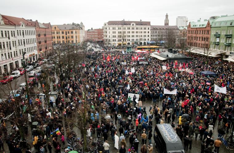 Möllevångstorget har sällan varit så packat med människor som den 16 mars. Under parollen Kämpa Malmö fylldes torget och gatorna runt omkring till bristningsgränsen. Polisens uppskattning låg på 10 000 personer. Andra menar att det var betydligt fler och de sista deltagarna stod fortfarande kvar på torget när frontbanderollen nådde centrum.