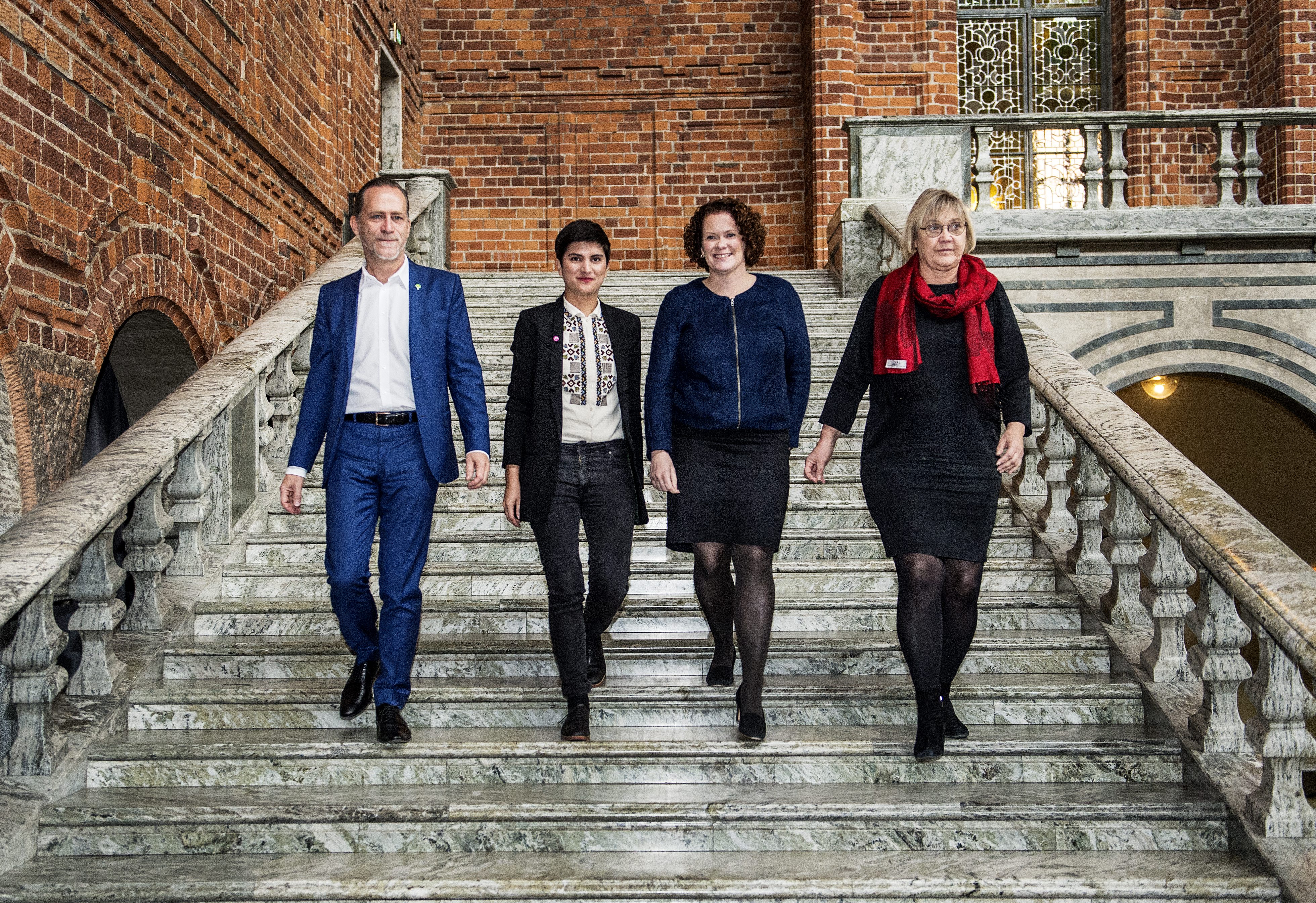 • SFT har granskat samtliga partiers nomineringar till bolagsstyrelserna. Majoriteten – här Daniel Helldén (MP), Sissela Nordling Blanco (Fi), Karin Wanngård (S) och Ann-Margarethe Livh (V) – vill ha jämnare könsfördelning i stadens bolag.