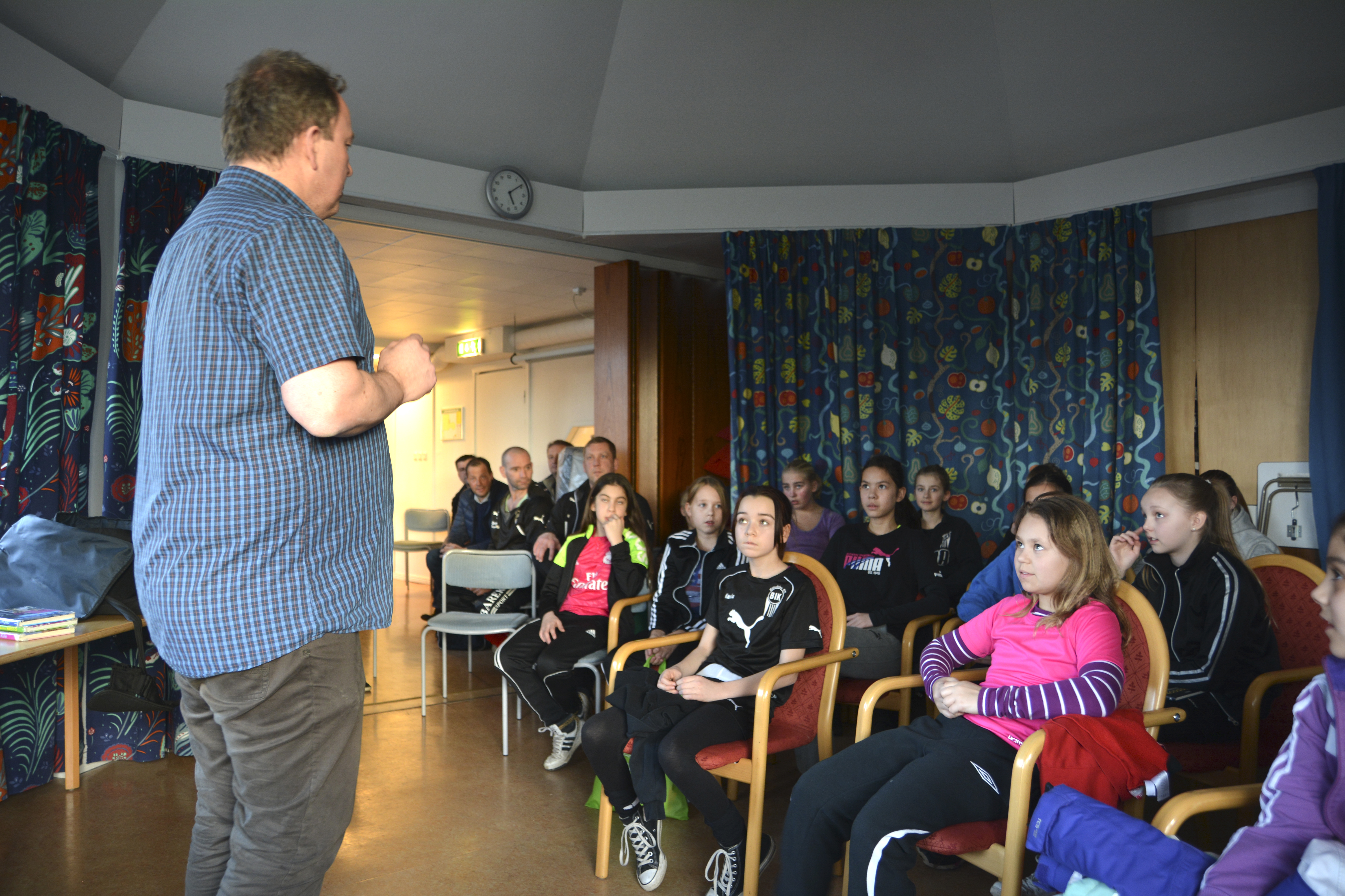 När Thomas Halling har avslutat med att berätta spännande cliffhangers om sina senaste böcker, är det dags för barnen att åka till fotbollsplanen för den vanliga träningen. På vägen ut säger Ellen Nilekull och Linnéa Ottosson att det tycker att Läskondis är ett bra initiativ.