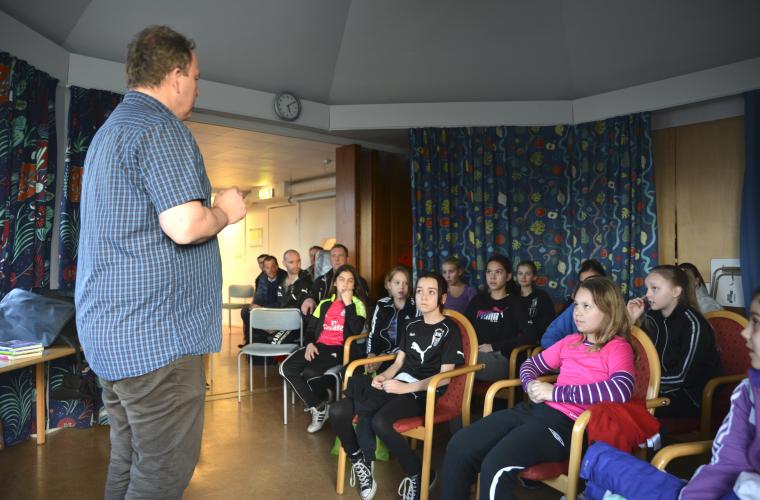 Det är författarträff med projektet Läskondis på biblioteket i Bjuv, och barn- och ungdomsförfattaren Thomas Halling är här för att prata med spelarna i Billesholm IK 02-03 om läsning.