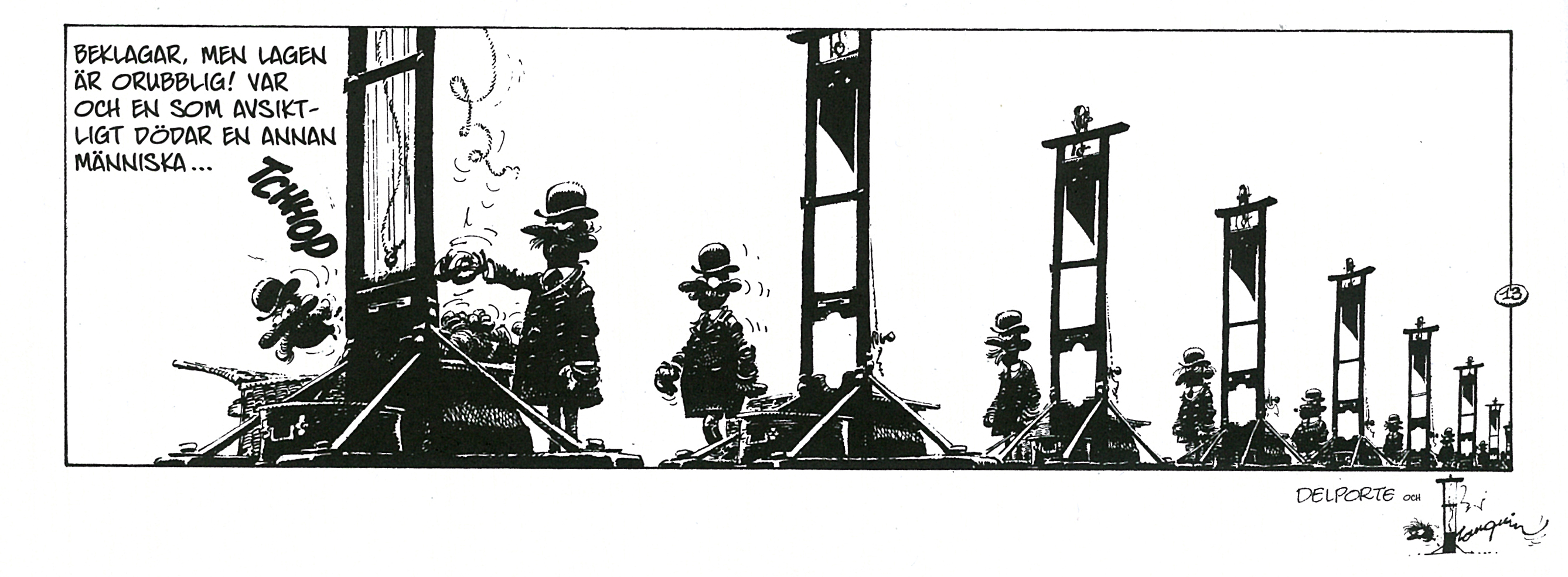 De teman som Franquin berör är delvis tidstypiska. Här finns flera starka serier som avslöjar dödsstraffets meningslöshet. I Frankrike avrättades den sista människan 1977 med hjälp av giljotin. 1981 avskaffades dödstraffet i landet och det är en debatt där Franquin uppenbarligen var närvarande.