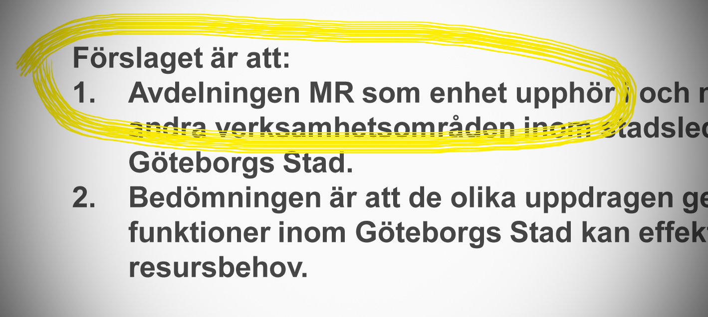 Då sa HR-chefen Karin Åhström endast att ”någon förändring kommer det att bli”, men i interna dokument som GFT nu har tagit del av står det uttryckligen att ”avdelningen MR som enhet upphör”. Enheten jobbar bland annat med hbtq- och antirasistiska frågor, exempelvis genom samråd med olika samhällsgrupper. Enligt de interna handlingarna föreslås MR-avdelningens åtta tjänster att minskas till noll redan i juli.