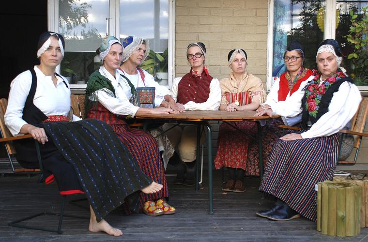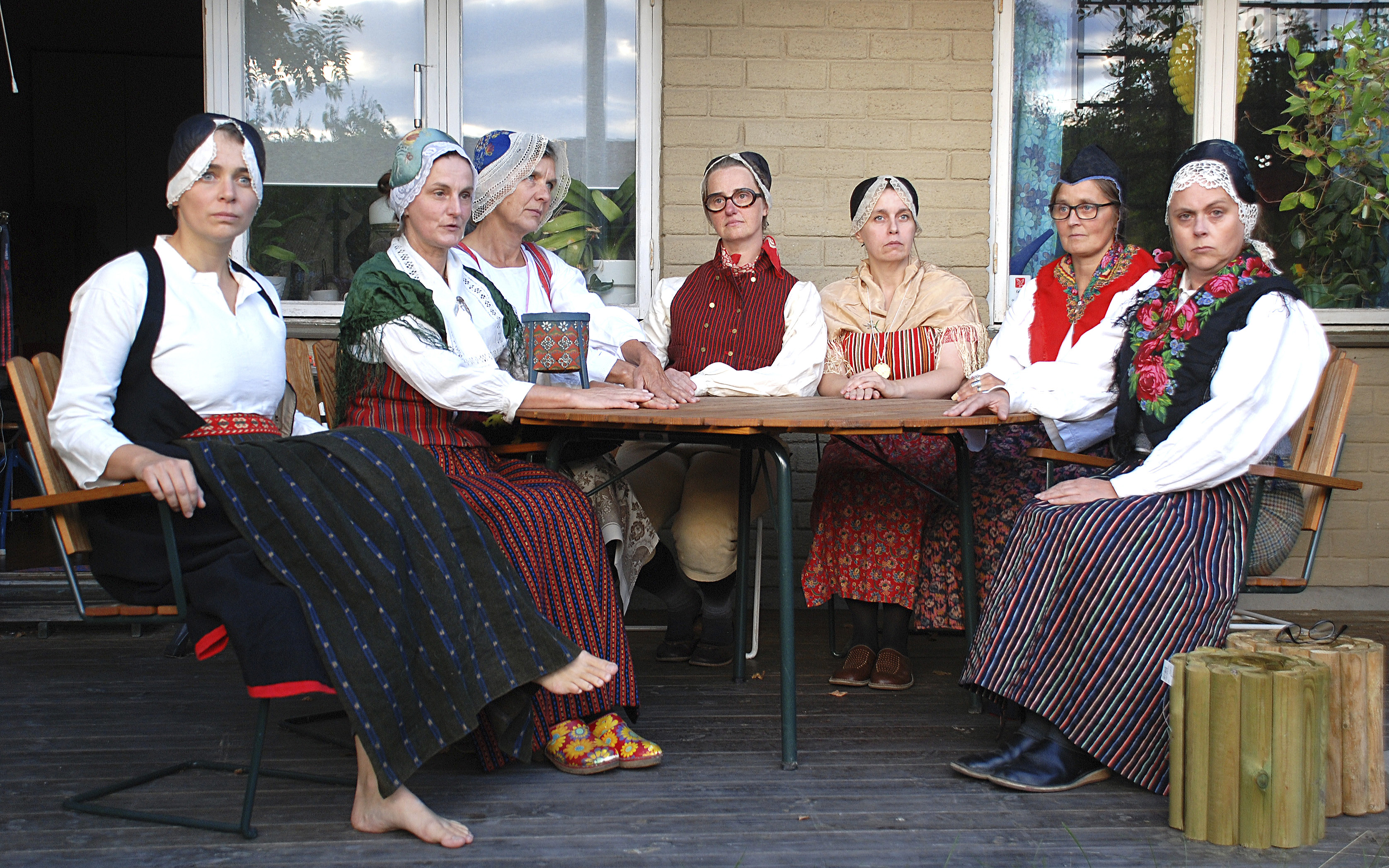 Ett av gruppens gemensamma projekt var att under en workshop göra skånska huvudbonader i papper och sätta på sig. Därifrån gick de vidare till att klä ut sig i traditionella dräkter och fotografera när de poserar som skånebrudar.