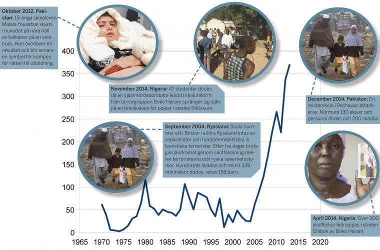 Terroristdåd mot skolor och utbildningsinstitutioner är ovanliga och utgör bara runt 3-4 procent av det totala antalet terroristdåd per år, enligt siffror från den globala terrorisdatabasen, the Global Terrorism Database, GTD. Men enligt en ny rapport från institutet syns en tydlig uppgång bland dessa attacker och många har uttryckt sin bestörtning över utvecklingen.