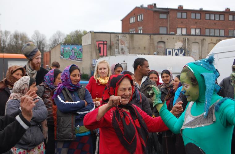 Många av EU-migranterna i lägret är vid gott humör. De berättar att de är lättade över att beslutet om avhysningen har skjutits upp och att de är glada över att så många har kommit för att visa sitt stöd. Utanför husvagnarna bjuds det på kaffe. Några andra bjuder upp till dans.