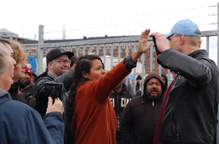 Mannen tar tag i flera banderoller som har hängts upp utanför lägret och försöker riva ner dem. Enligt nätverket Solidaritet med EU-migranter, som också finns på plats, går mannen ofta förbi lägret och tar foton och filmar personerna som bor där. Innan lägret i Pildammsparken revs brukade han även filma dem som bodde där och åka runt lägret på natten och tuta med sin bil.