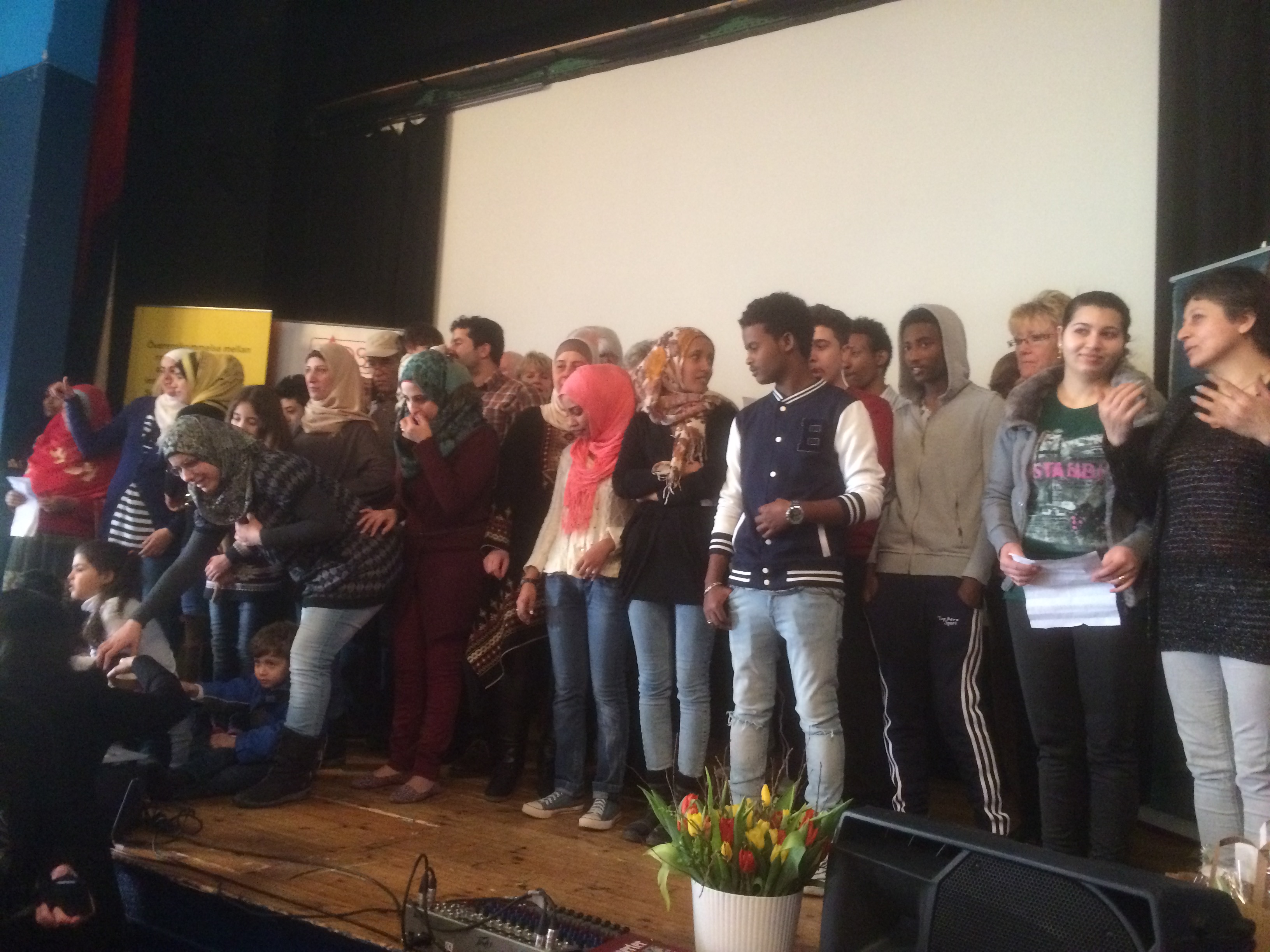 Vem som helst får droppa in och vara med och sjunga. Det brukar komma runt 20–25 personer. Oftast är majoriteten flyktingar.