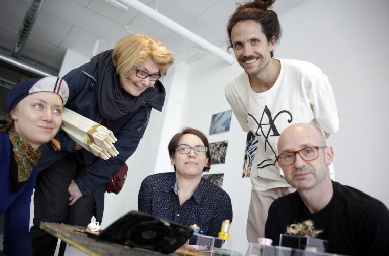 • Siri Tolander, Gun Öström Gratzer, Anna Ridderstad, Anton Alvarez och Stuart Mayes (alla konstnärer med ateljéer i huset) i Anna Edsjös utställning "Common Ground" som just nu visas i husets konsthall.