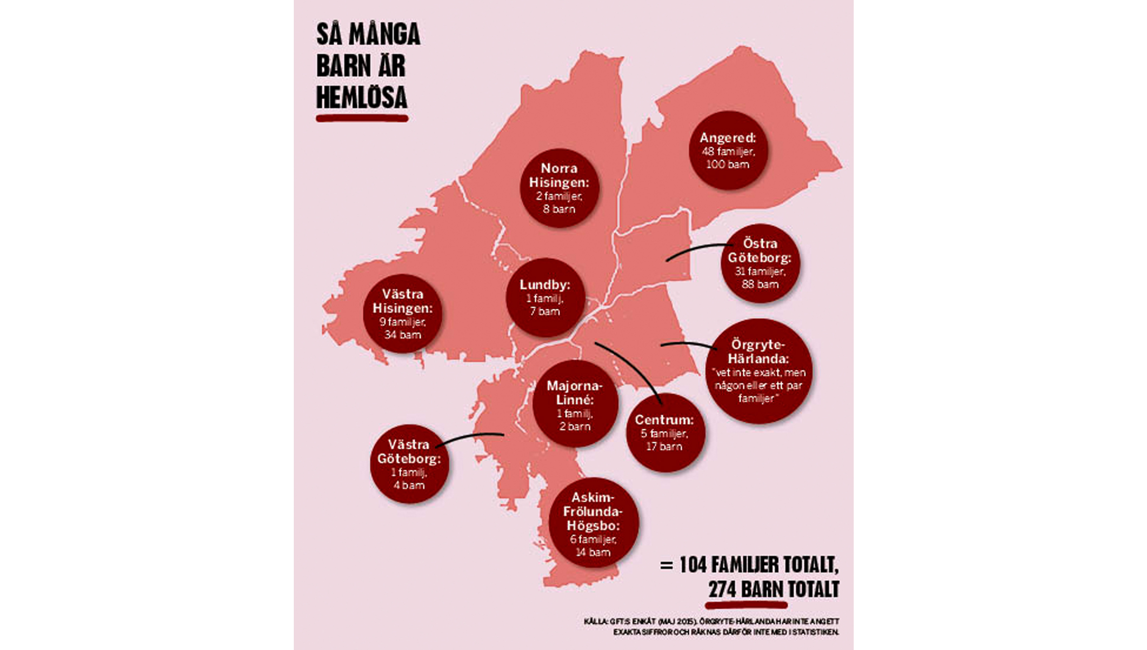 GFT har genom en unik enkätstudie kartlagt situationen i Göteborg. Socialkontoren i samtliga stadsdelar, utom Örgryte-Härlanda, har besvarat enkäten som visar att 104 familjer, med totalt 274 barn, är drabbade.